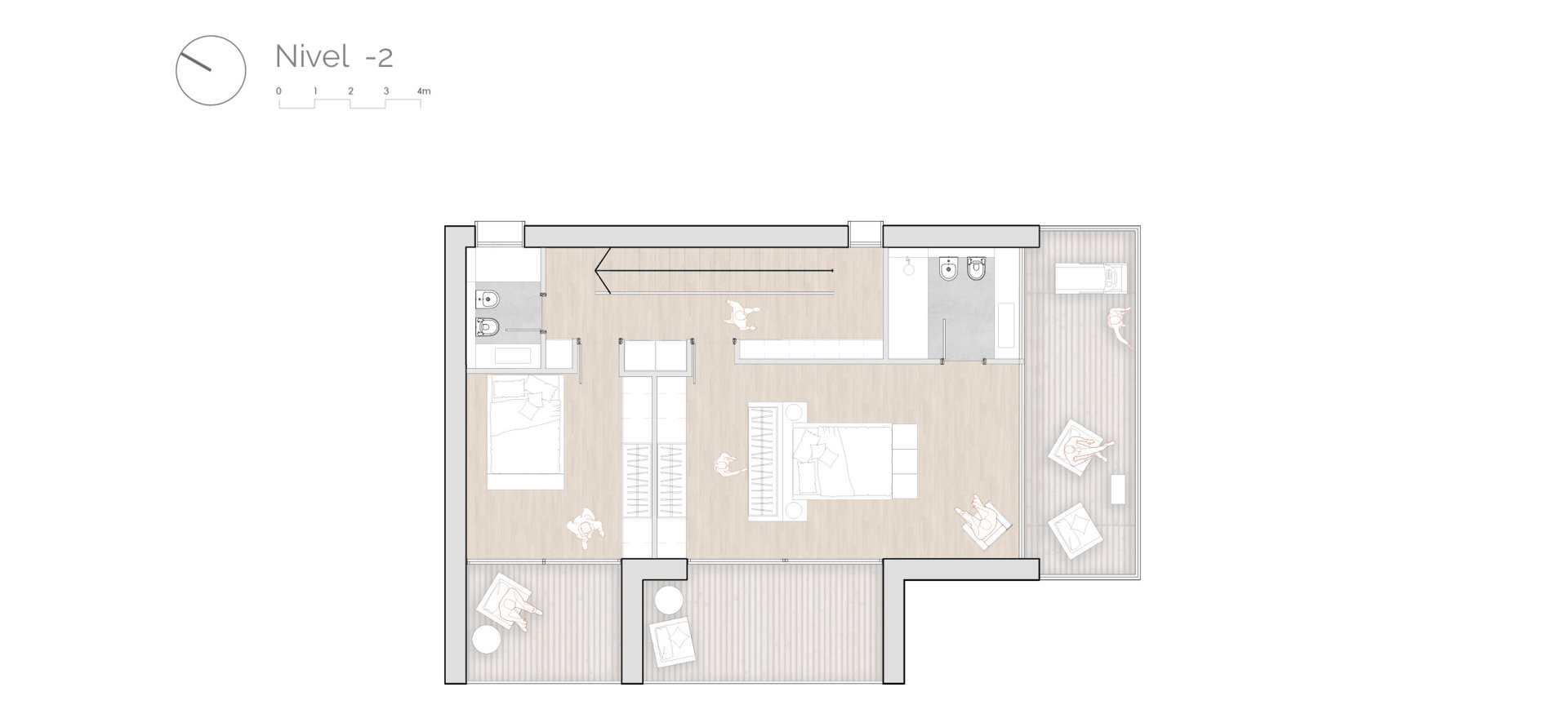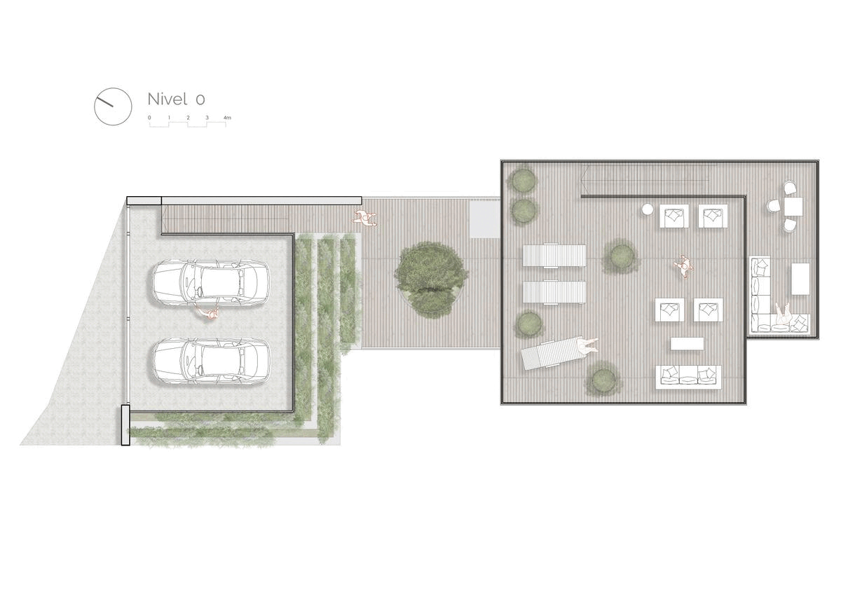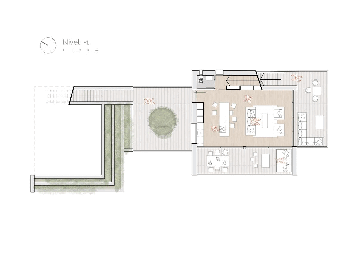 On the lower level, with an exit at the foot of the lot, more direct relations with the exterior are established.