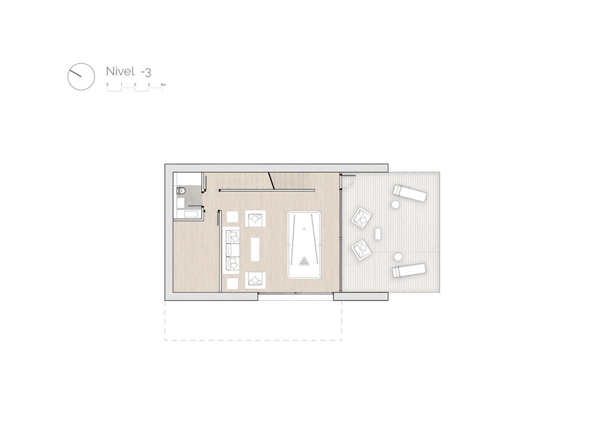 The two upper levels of the house are open to the landscape; however, at their intersection with the rock, intimate courtyards are generated that allow cross ventilation and provide nuances of natural lighting.