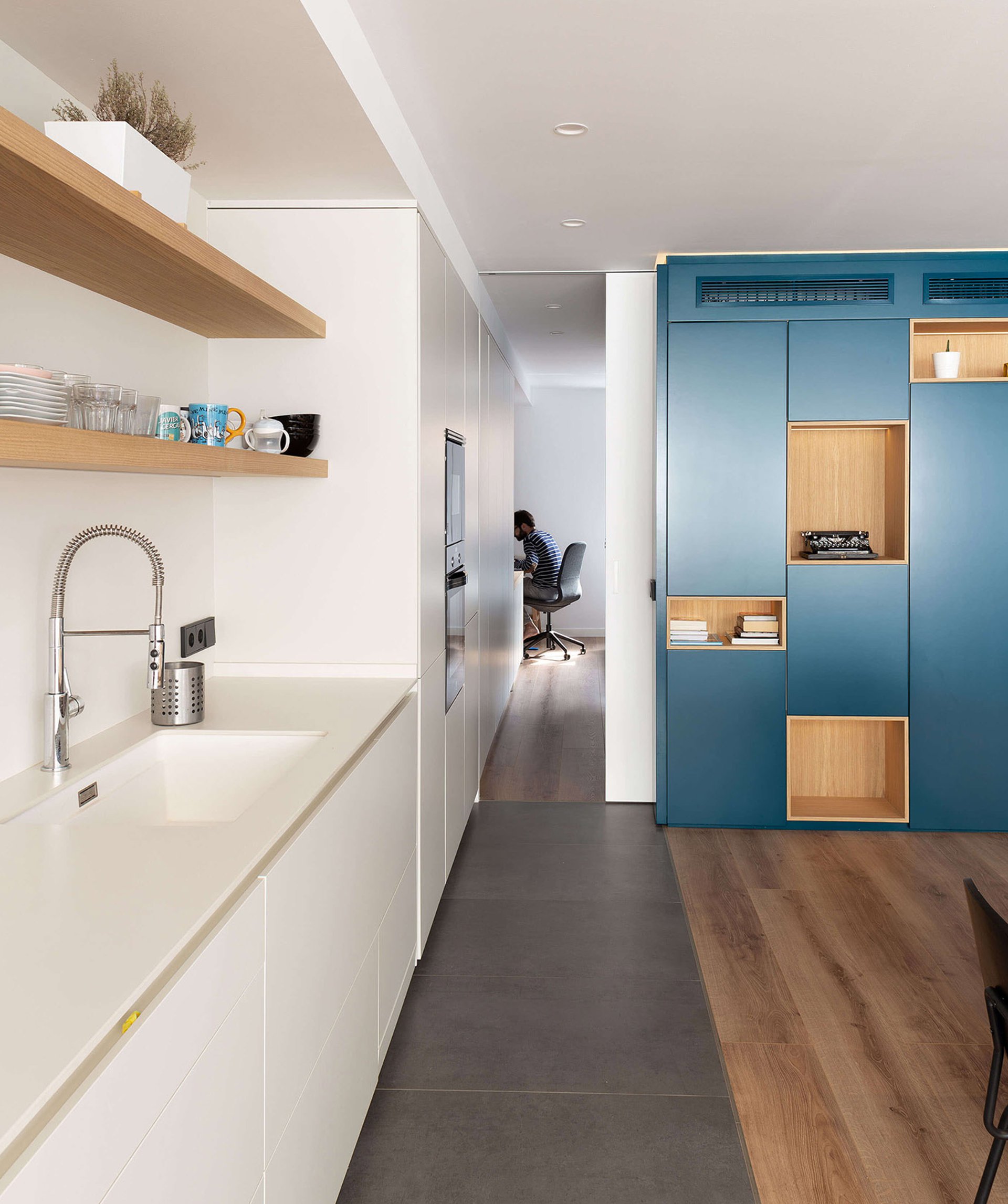 This blue cube that vibrates to the respectful and cheerful rhythm of its inhabitants, houses in its interior multiple functions: air conditioning installation, two bathrooms, bedroom closets and a multifunctional closet overlooking the living room, and that even serves as a bench to sit on to take off your shoes when you arrive.