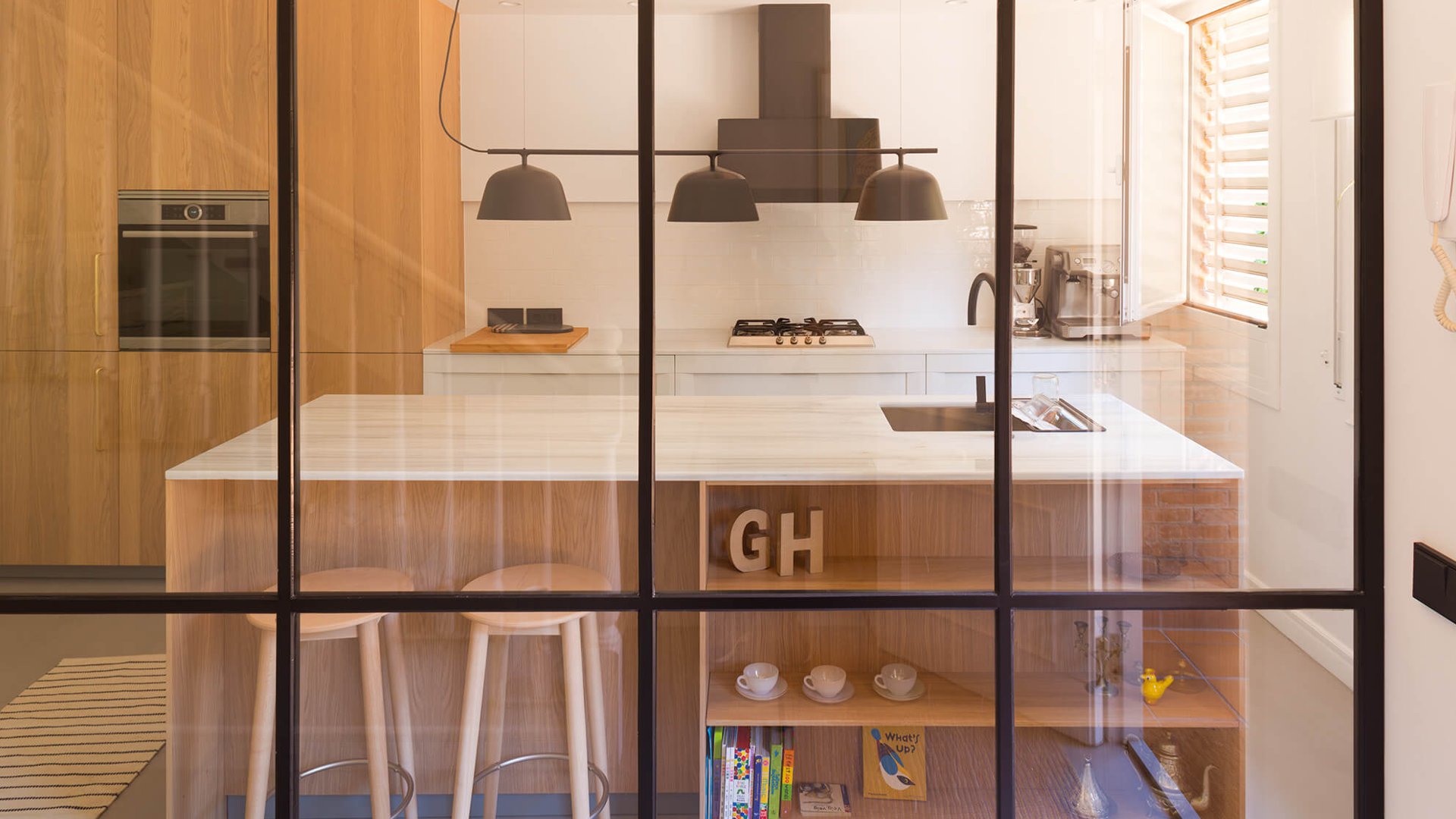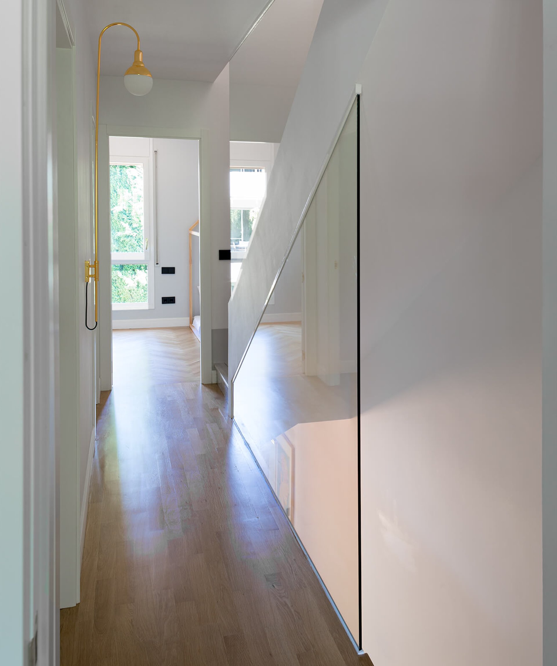 The spaces of kitchen, dining room, living room, are a continuum that are differentiated from each other thanks to a selective change of materiality in furniture and flooring.