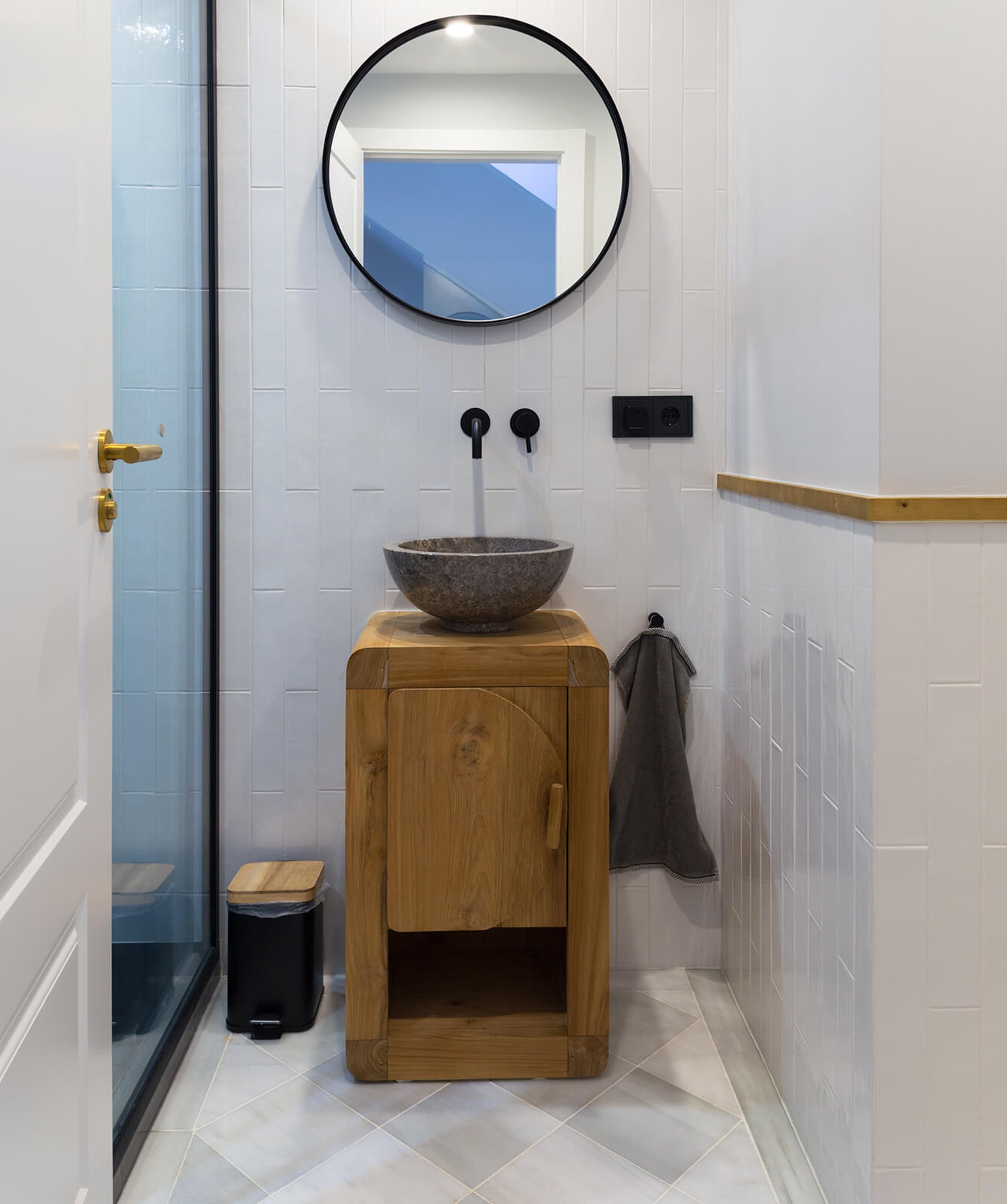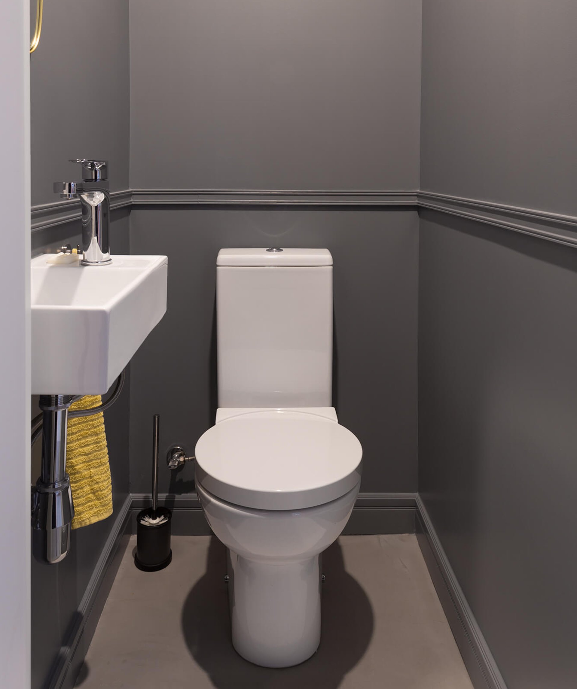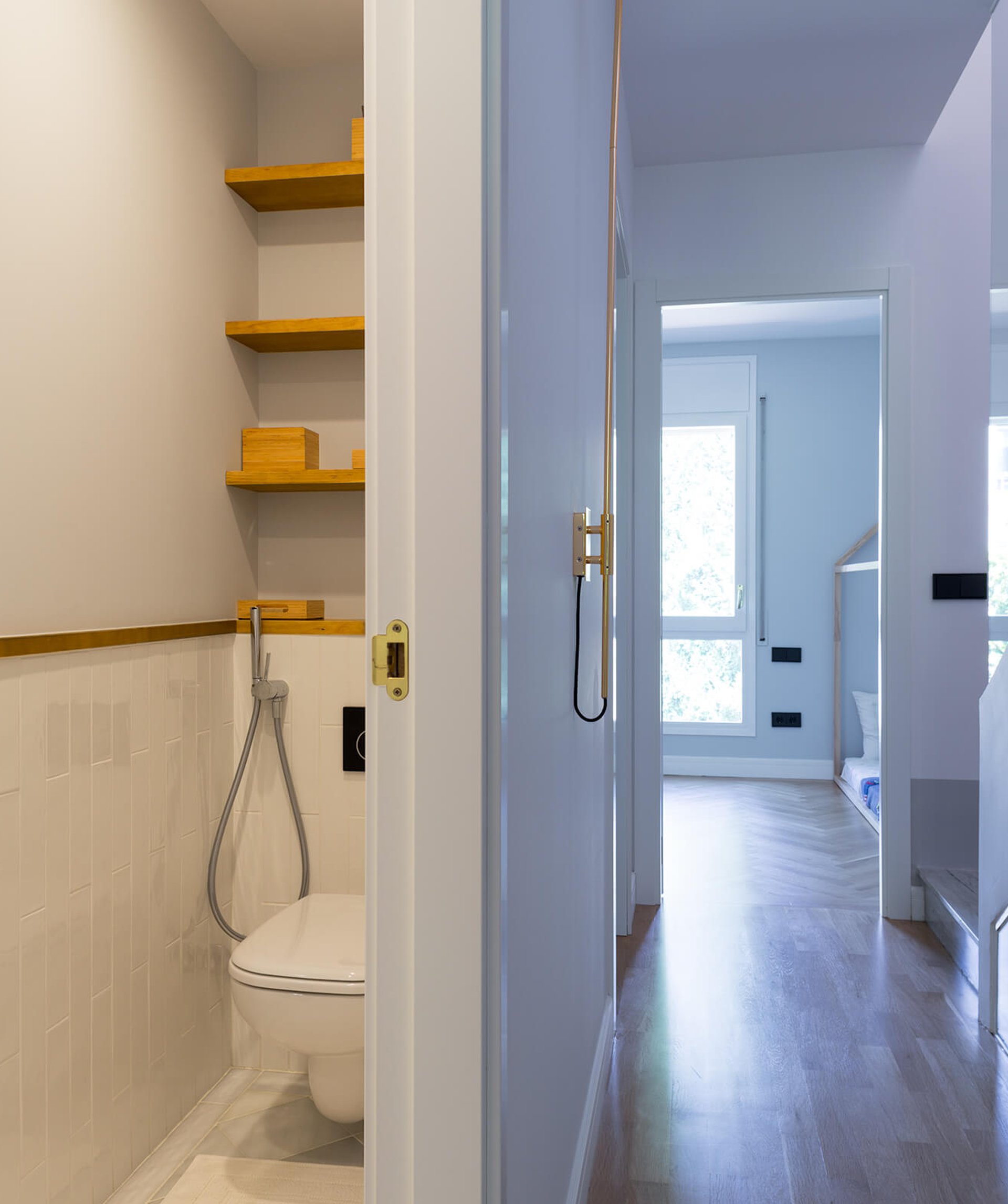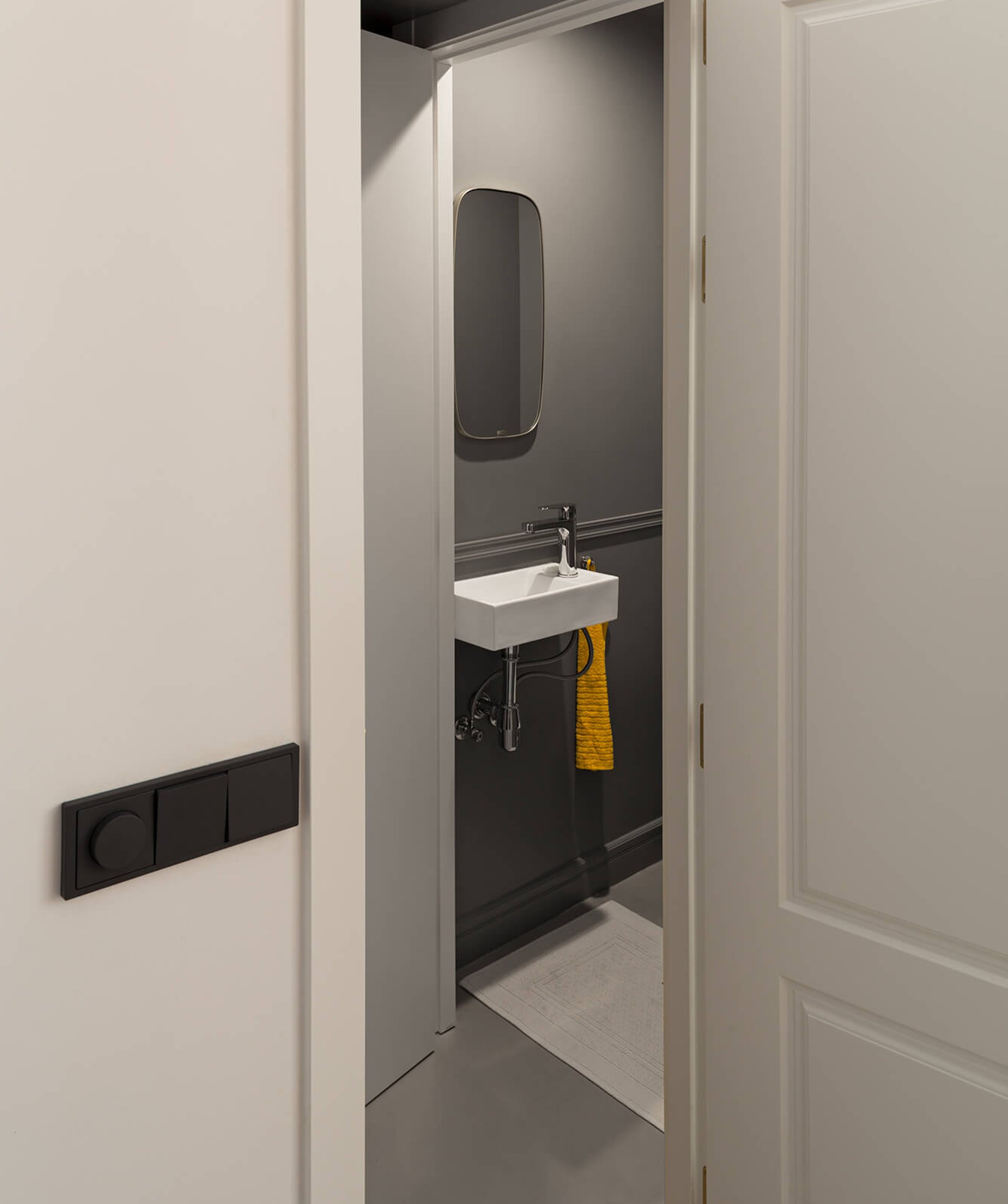 Respecting axes and symmetries that give harmony to the whole, we were forced to fit the courtesy toilet in a scarce 90 cm2…that even painted all of it in dark gray, does not expel us from its enclosure.