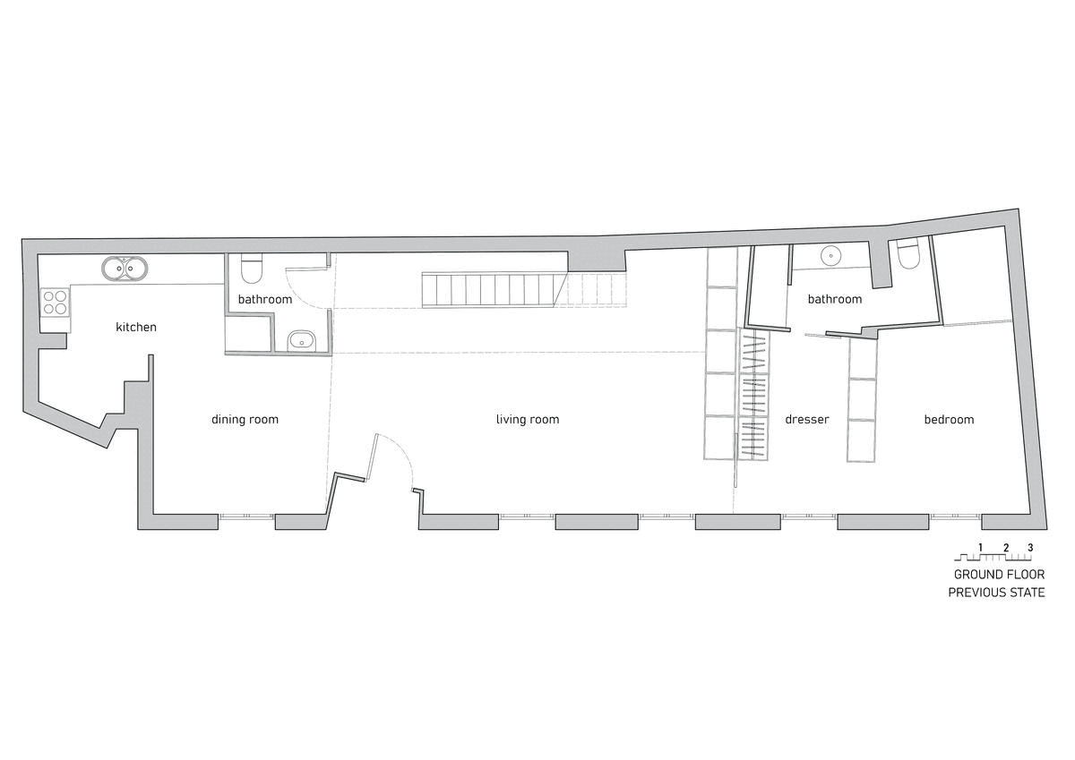 The proposed functional configuration for the ground floor takes a different direction: here, the goal was to integrate the kitchen while expanding the usable area of the dining space. To achieve this, the intervention involved removing the toilet, which had previously blocked the kitchen and relegated it to a dark, tunnel-like space.