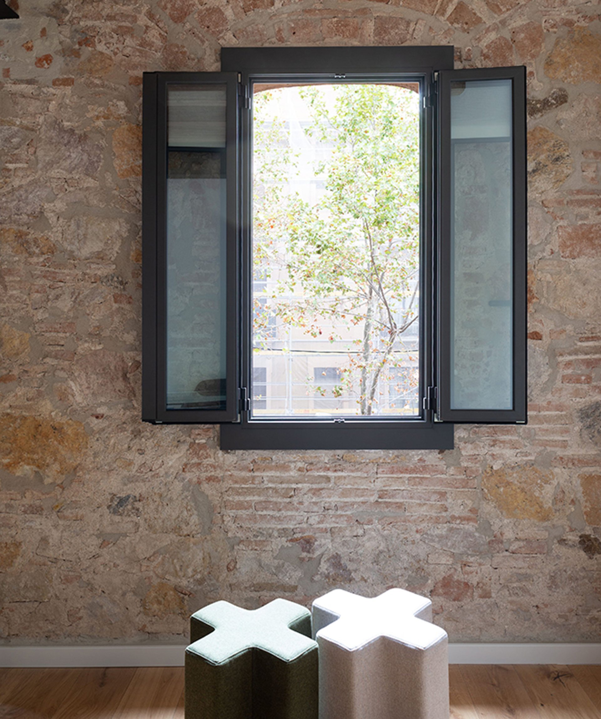 The other materials chosen for the project are subtle and minimal, meant to engage in dialogue with the essential beauty of the pre-existing elements, in an act of gratitude and harmony.