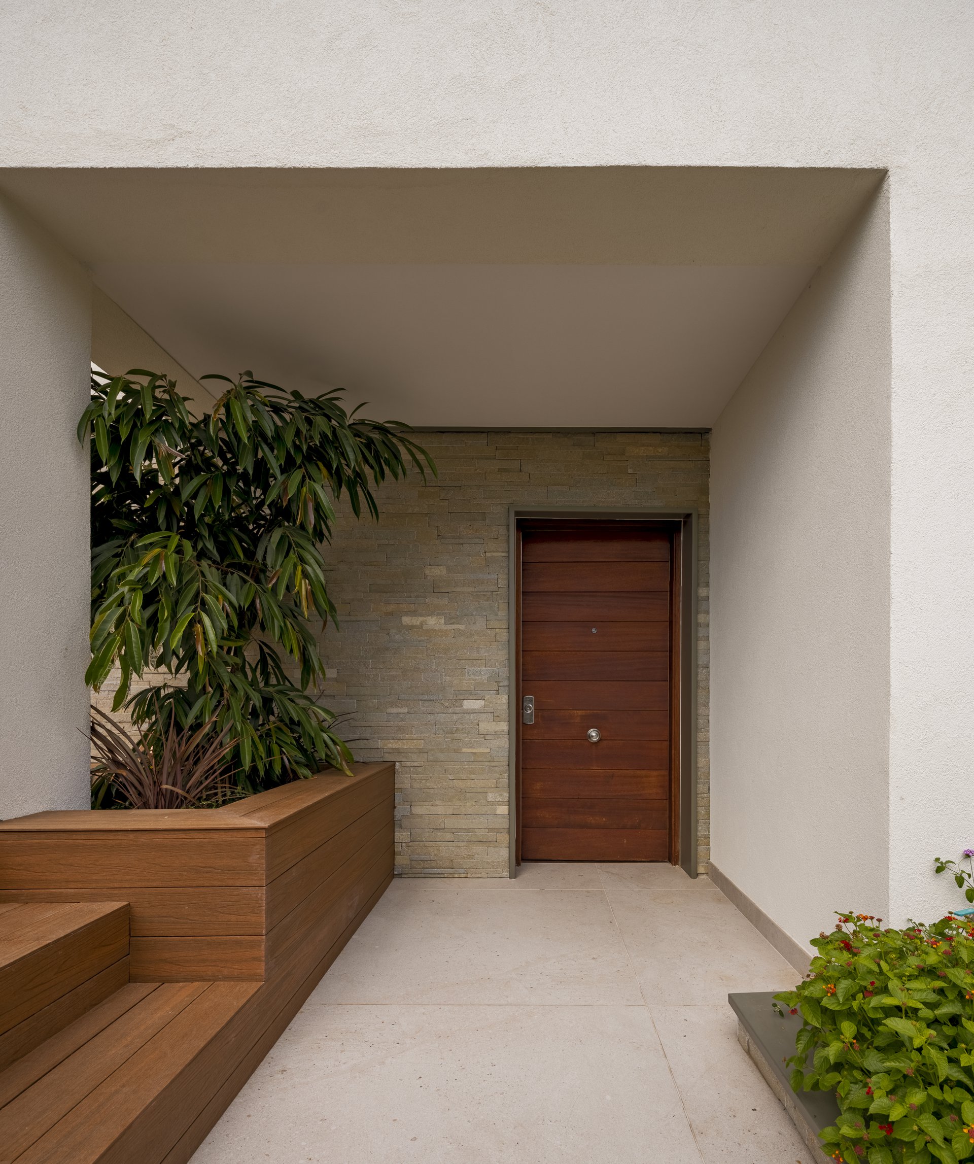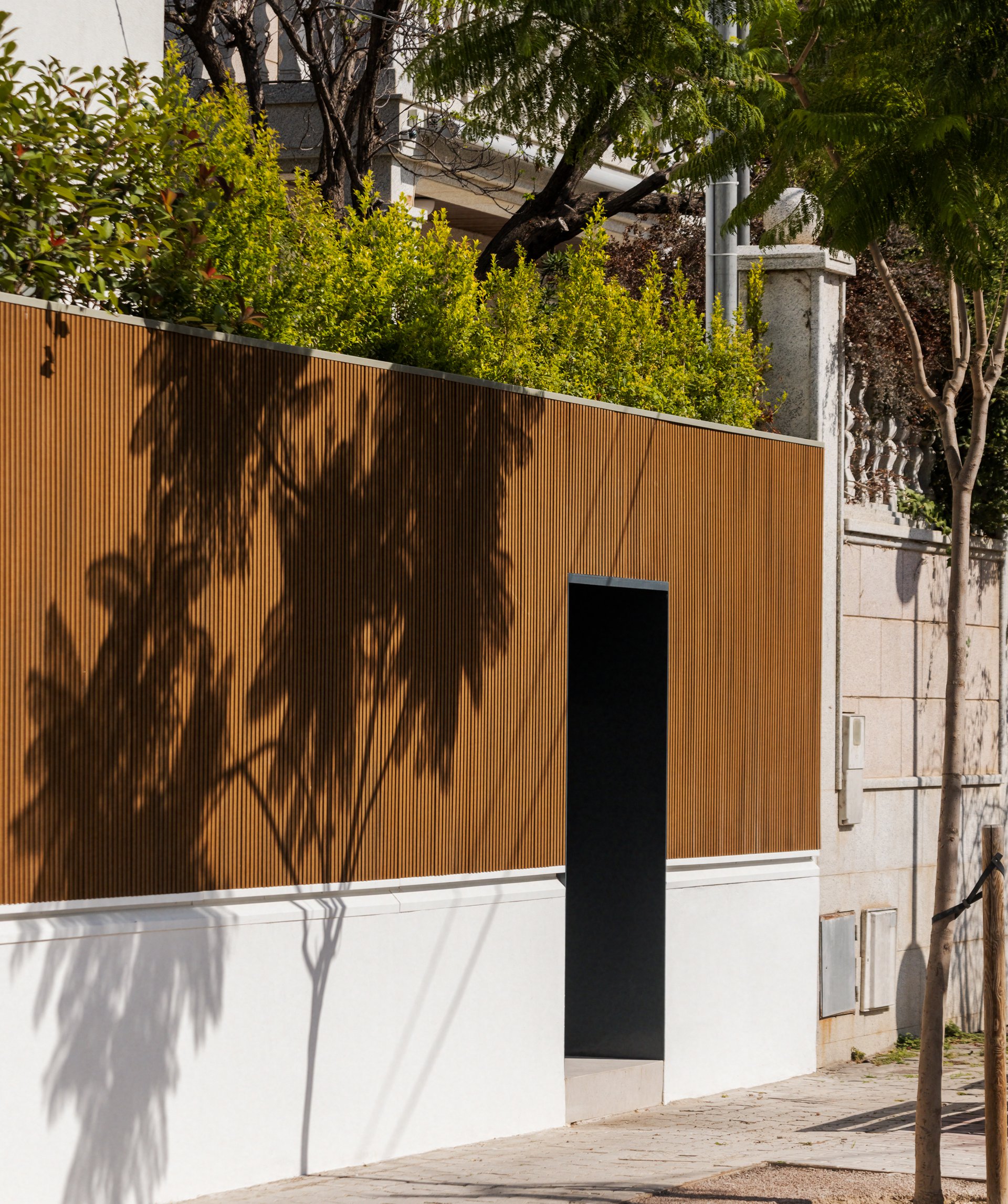 The fence designed for the facade was given a materiality and height that not only provides the required security but also acts as a visual filter for the winter garden located above the garage, renewing the style of the house without losing its essence.