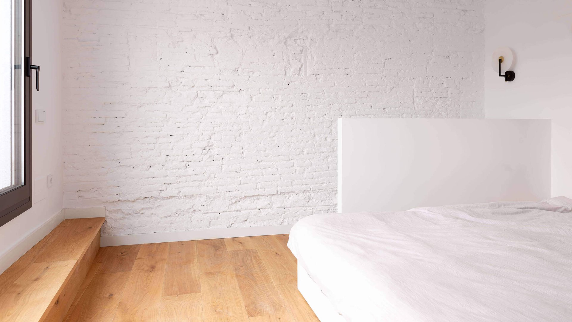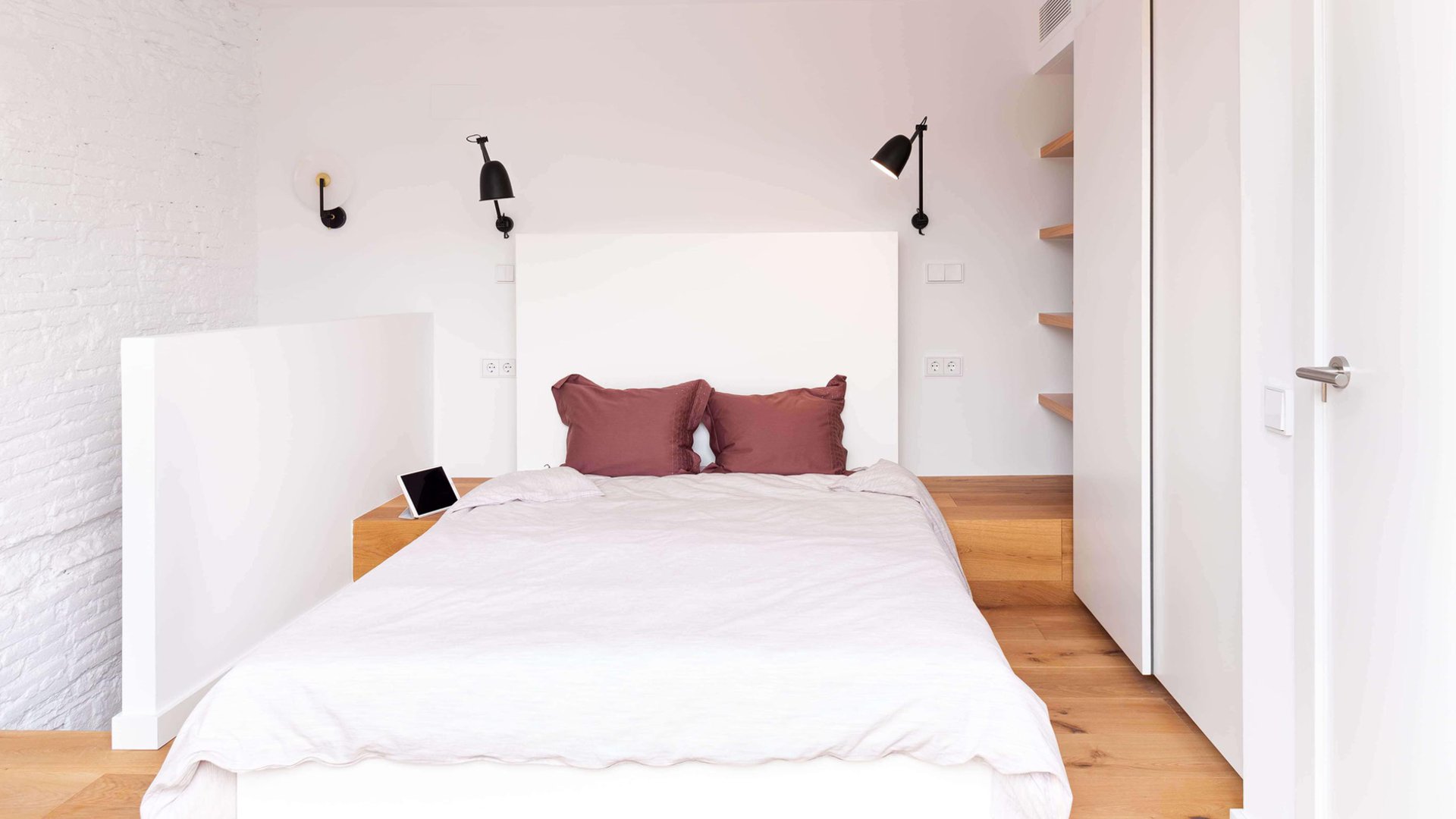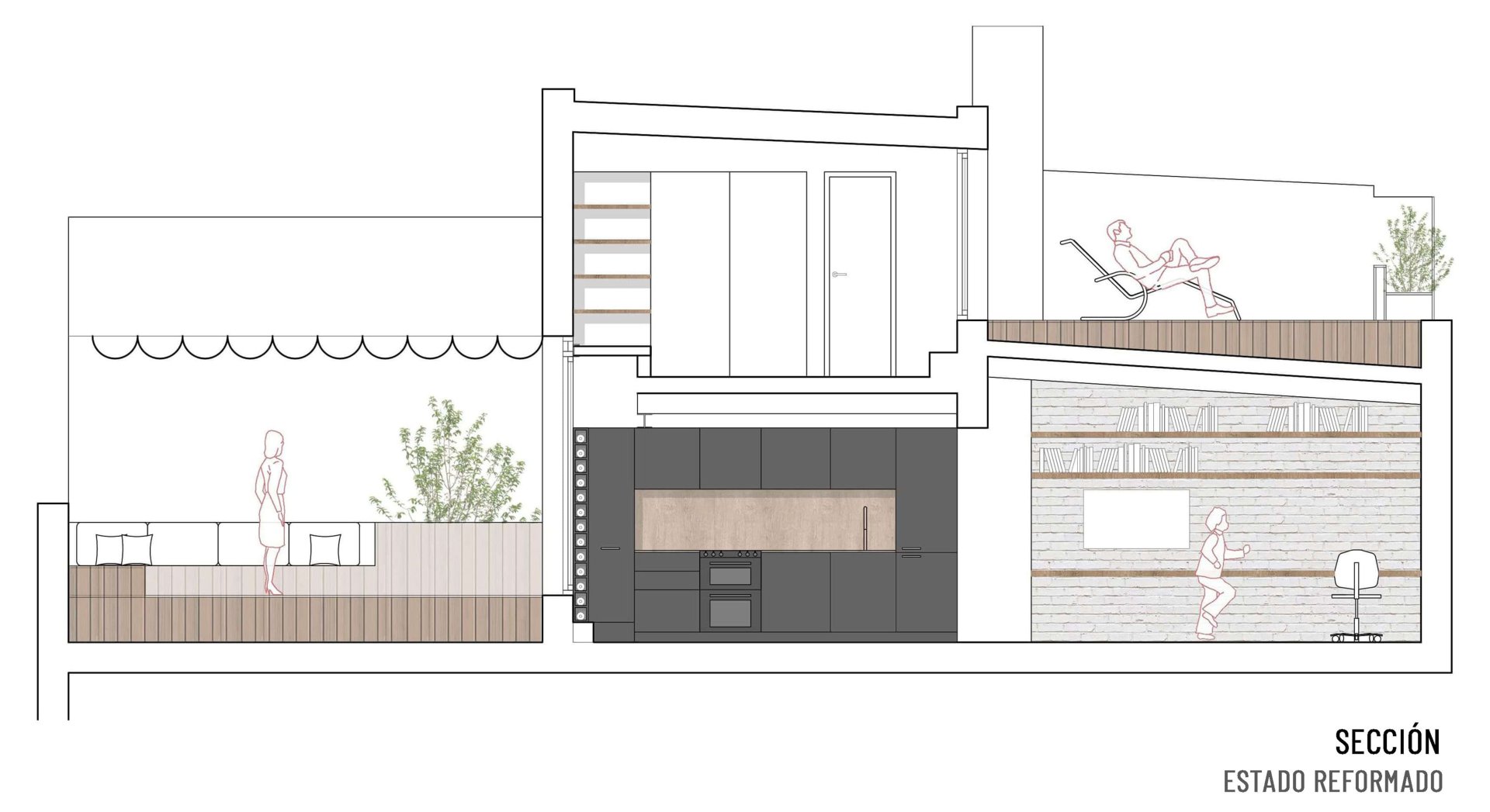 The story of this home begins with its location in the attic of a historic building in Ciutat Vella: a space of just 50 square meters, yet almost entirely surrounded by terraces on two levels, offering a theatrical view of the domes of the old city.