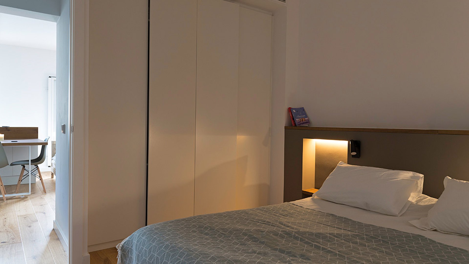 The length of the bathroom allows for this dual access, with a pivoting wardrobe that completes the required storage space.