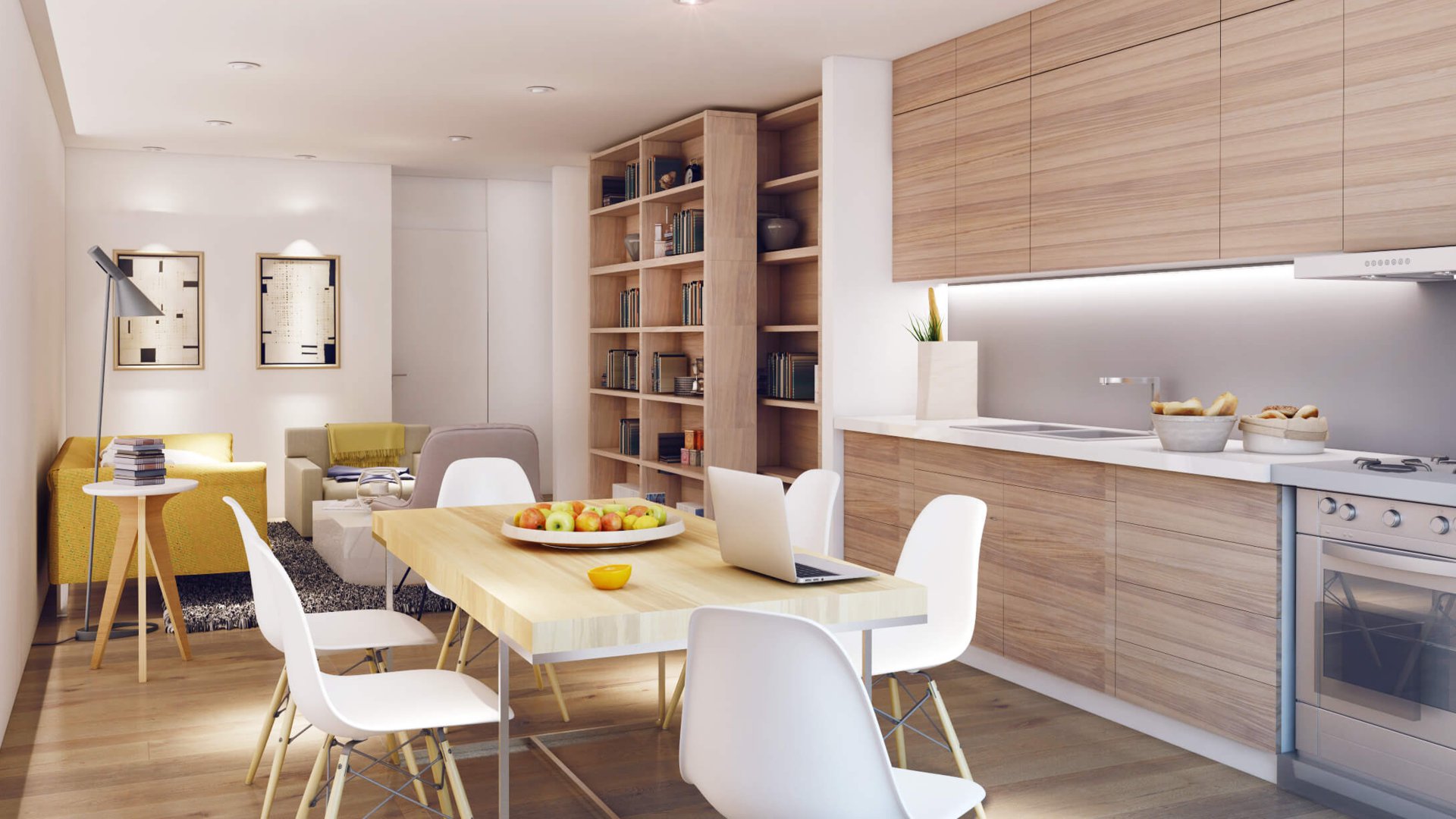 We helped achieve this by placing continuous wooden flooring. The same floor throughout the entire apartment. White walls.