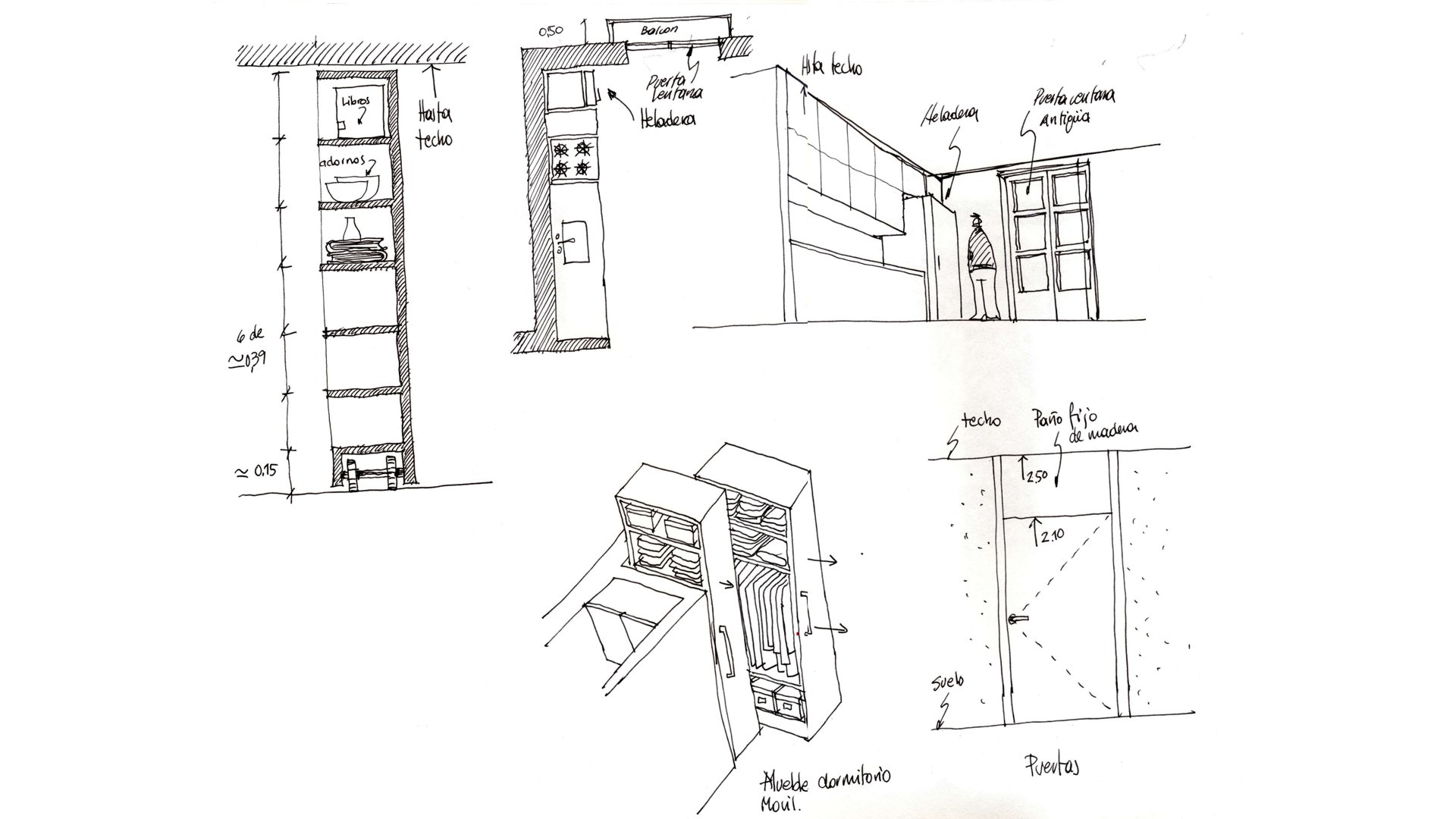 The master bedroom was conceived as an en-suite bedroom, while the extension of the rectangle, separated by sliding bookshelves, functions as a “study” and, occasionally, as a “guest bedroom” for the children who no longer live permanently in Barcelona.