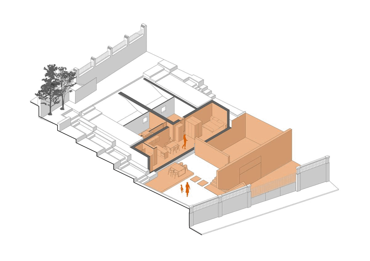 A new staircase leading to the ground floor internally connects the “elevated” house to a versatile space that opens onto the garden.
