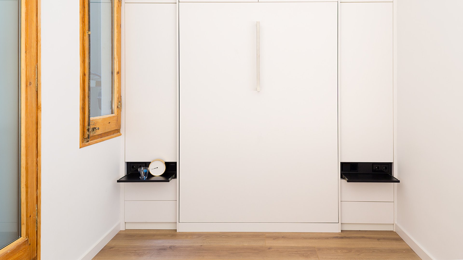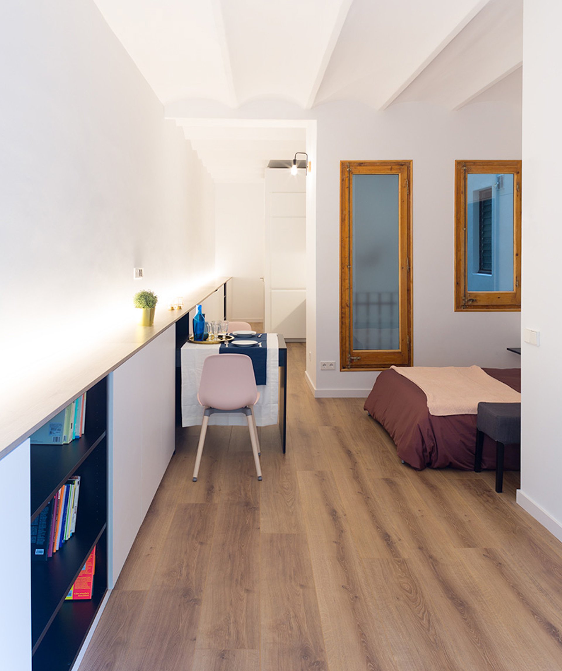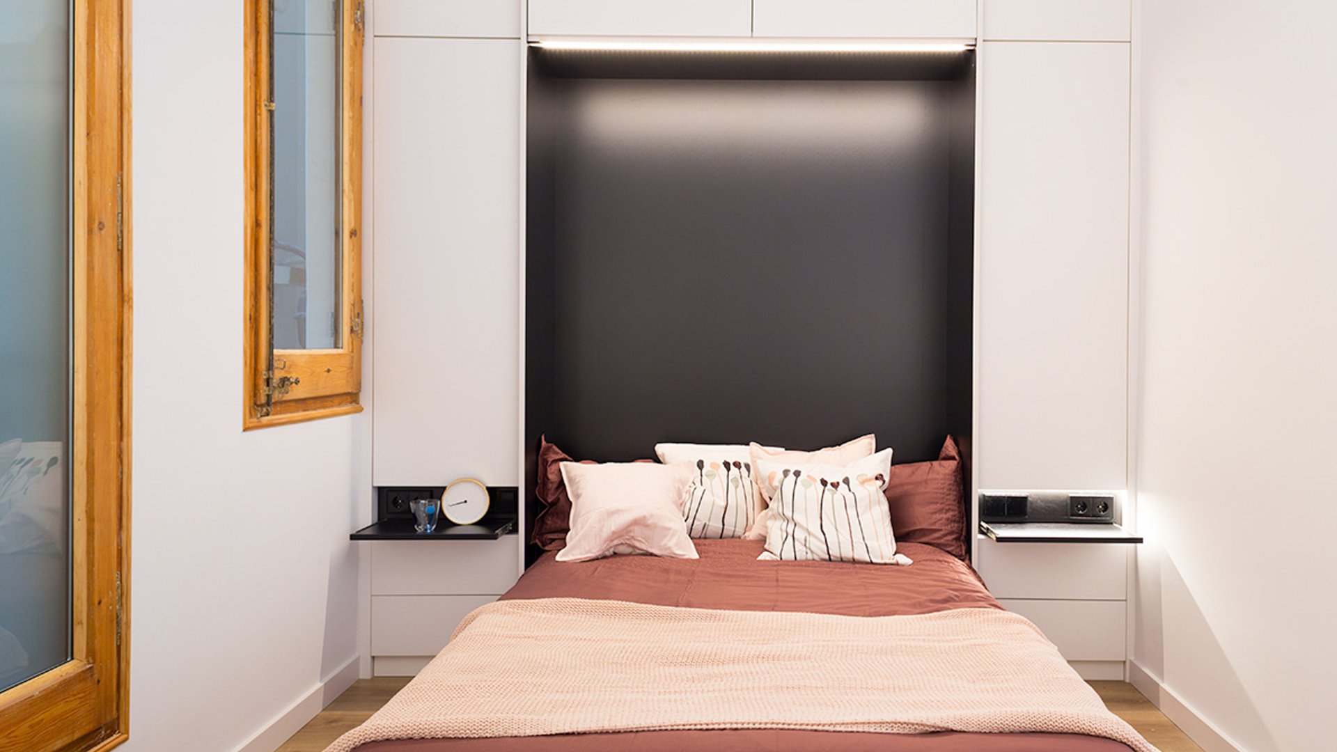 El diseño de un mueble abatible, contenedor de la cama de dos plazas, las mesitas de noche y el armario para la ropa colgada, sumado a otro mueble de 12 metros de longitud que recorre todo el largo del apartamento, lo hicieron posible.