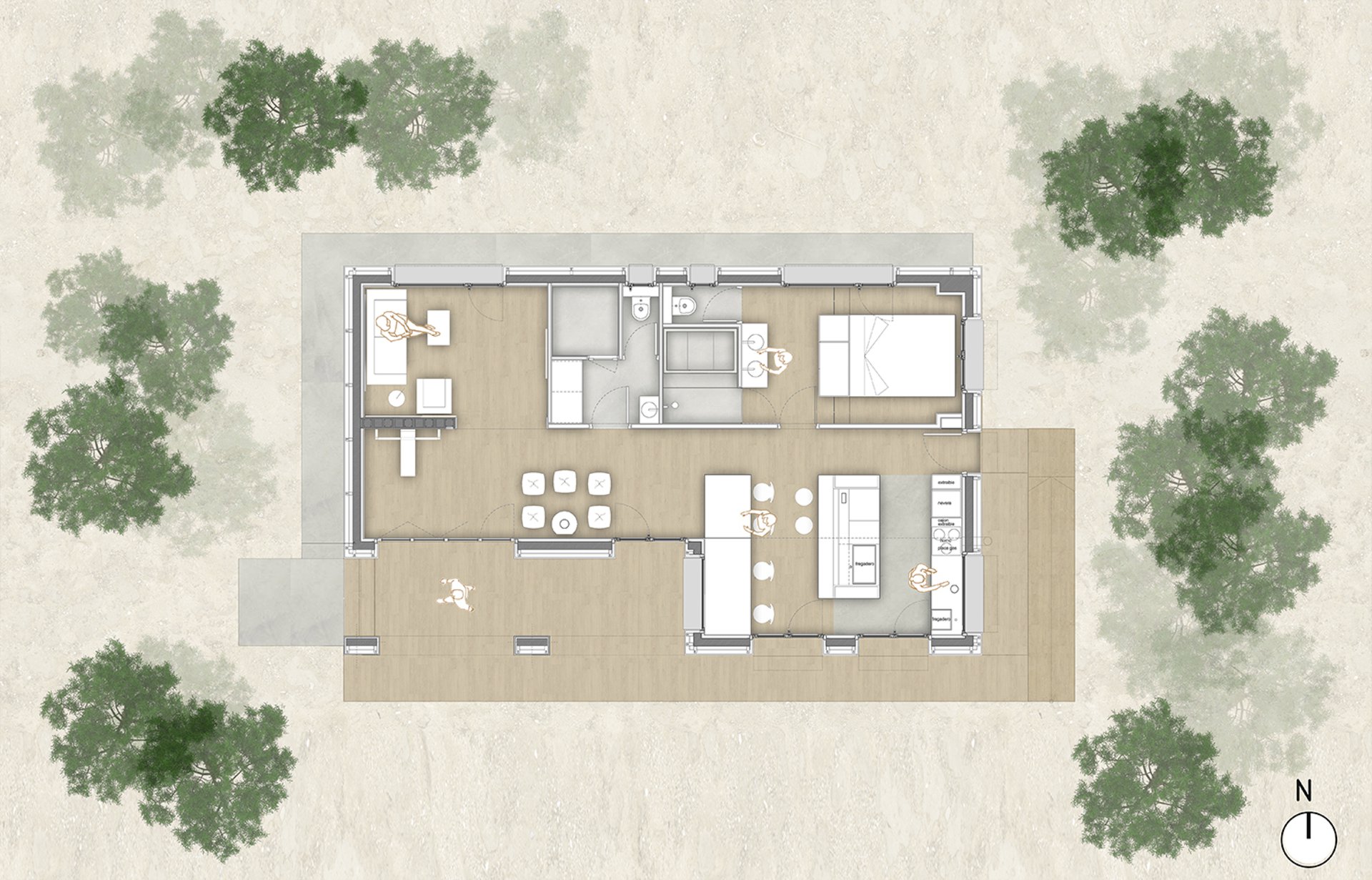 Y una chimenea de leña, aporta todo el acondicionamiento climático necesario durante los meses de invierno.