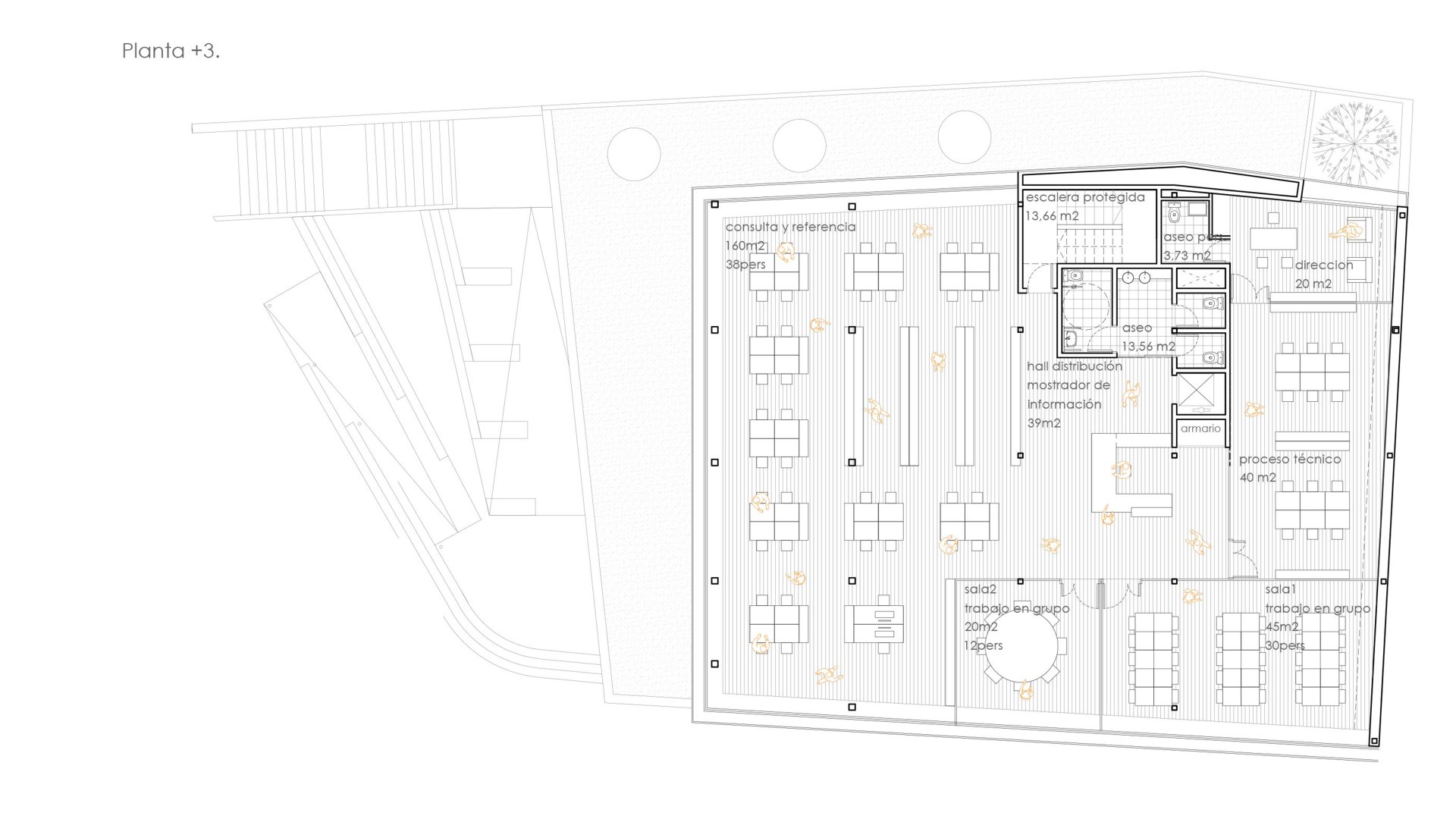 3- establecer un núcleo de servicios (formado por ascensor, escalera protegida, aseos ) que se repite en todas las plantas . La ubicación del ascensor en el núcleo posibilita la llegada del ascensor a todas las plantes permitiendo la eficiencia funcional del archivo ubicado en planta sótano, en estrecha relación con la Biblioteca