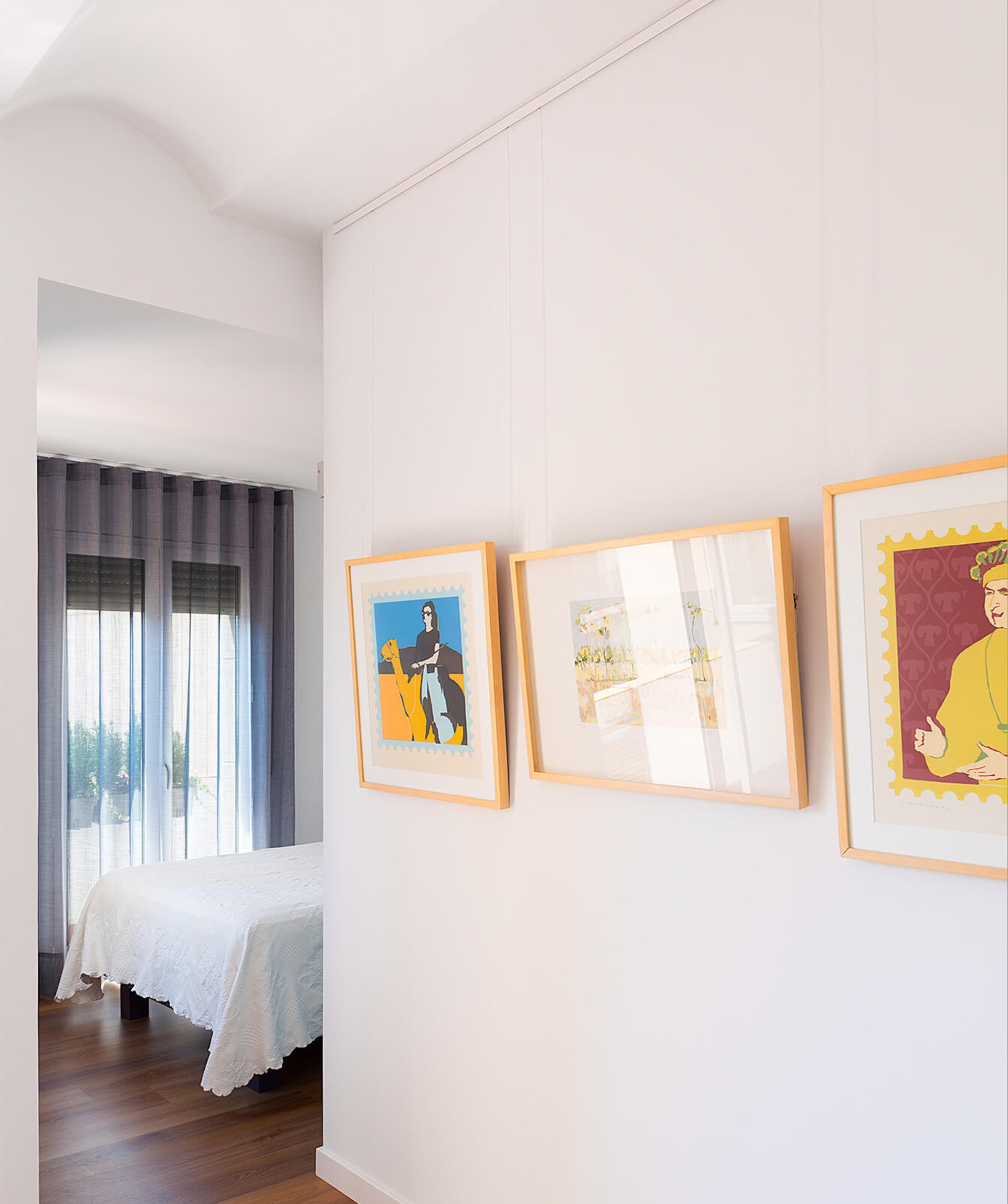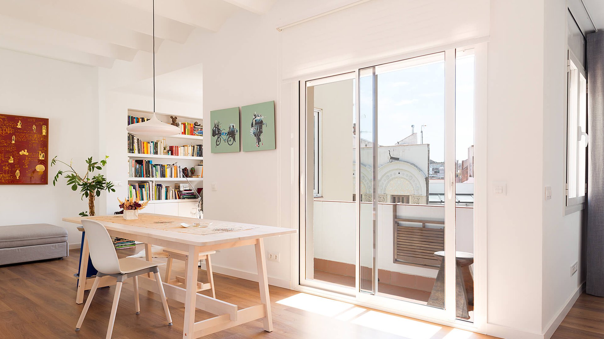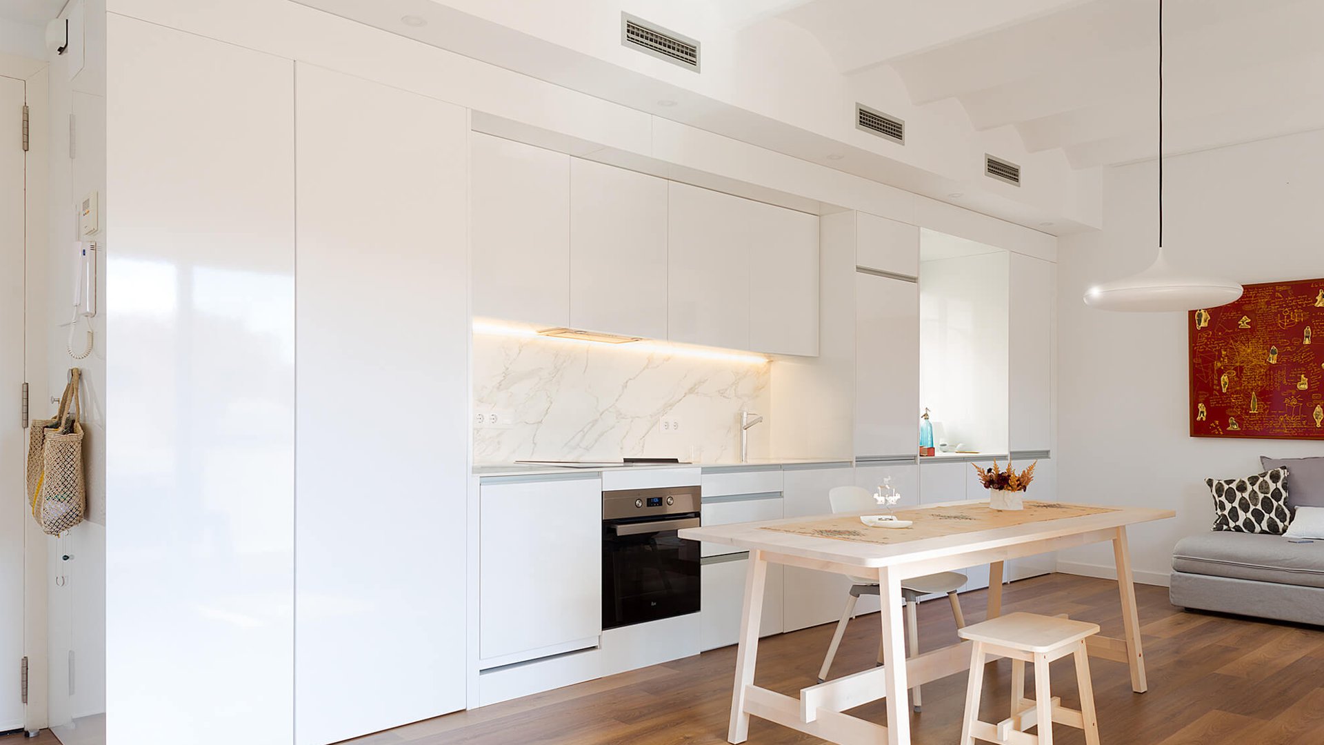 Potenciamos la unidad espacial, unificando el suelo con una tarima de madera y pintando las paredes en blanco roto.