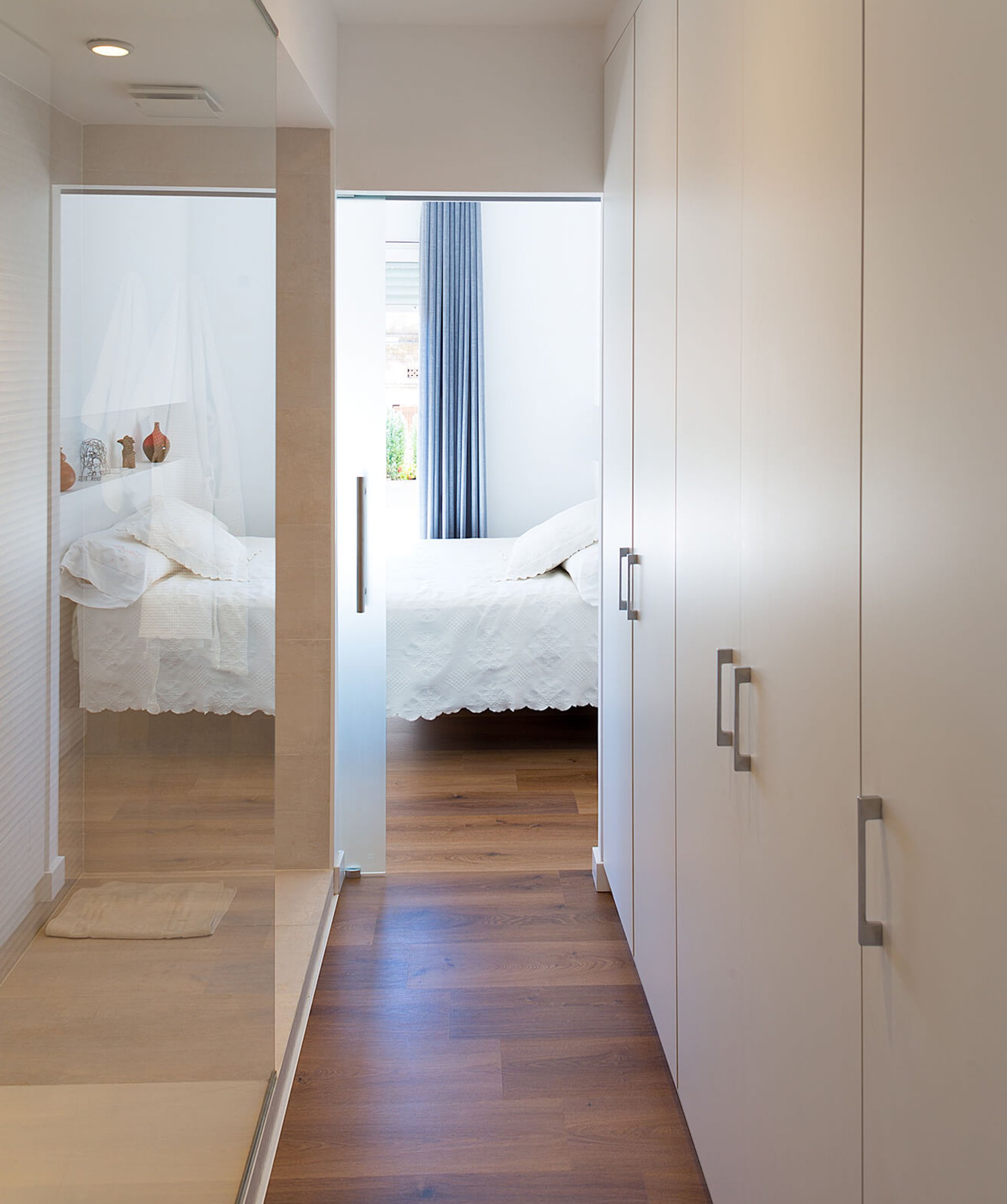 La ducha, forma parte del vestidor, y pivota entre el dormitorio y el toilette, y recibe toda la luz del día al separarse de la habitación principal con una puerta corredera de cristal.