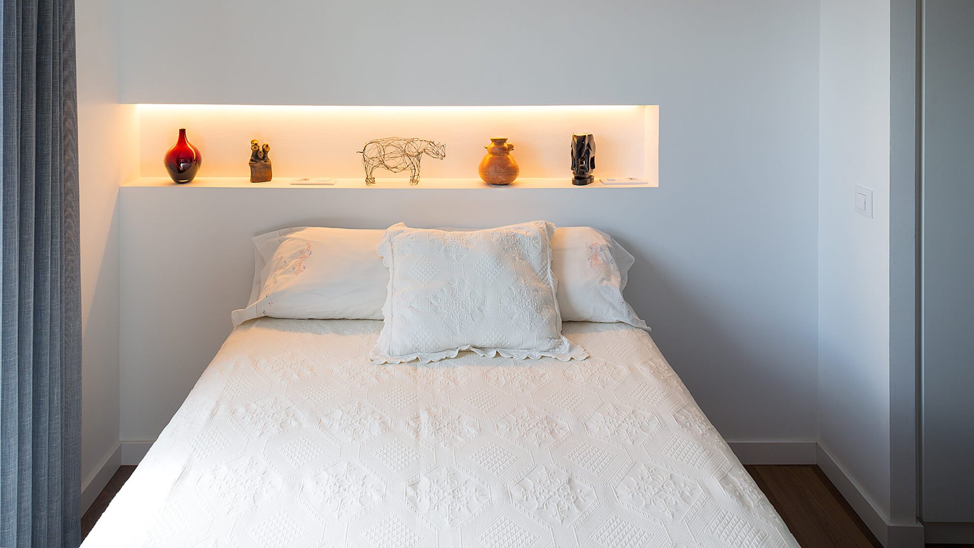 Para el diseño del mueble elegimos el blanco inmaculado y revestimos los dos grandes huecos en gris topo muy urbano, apropiado para este pequeño refugio situado en el corazón de Barcelona.