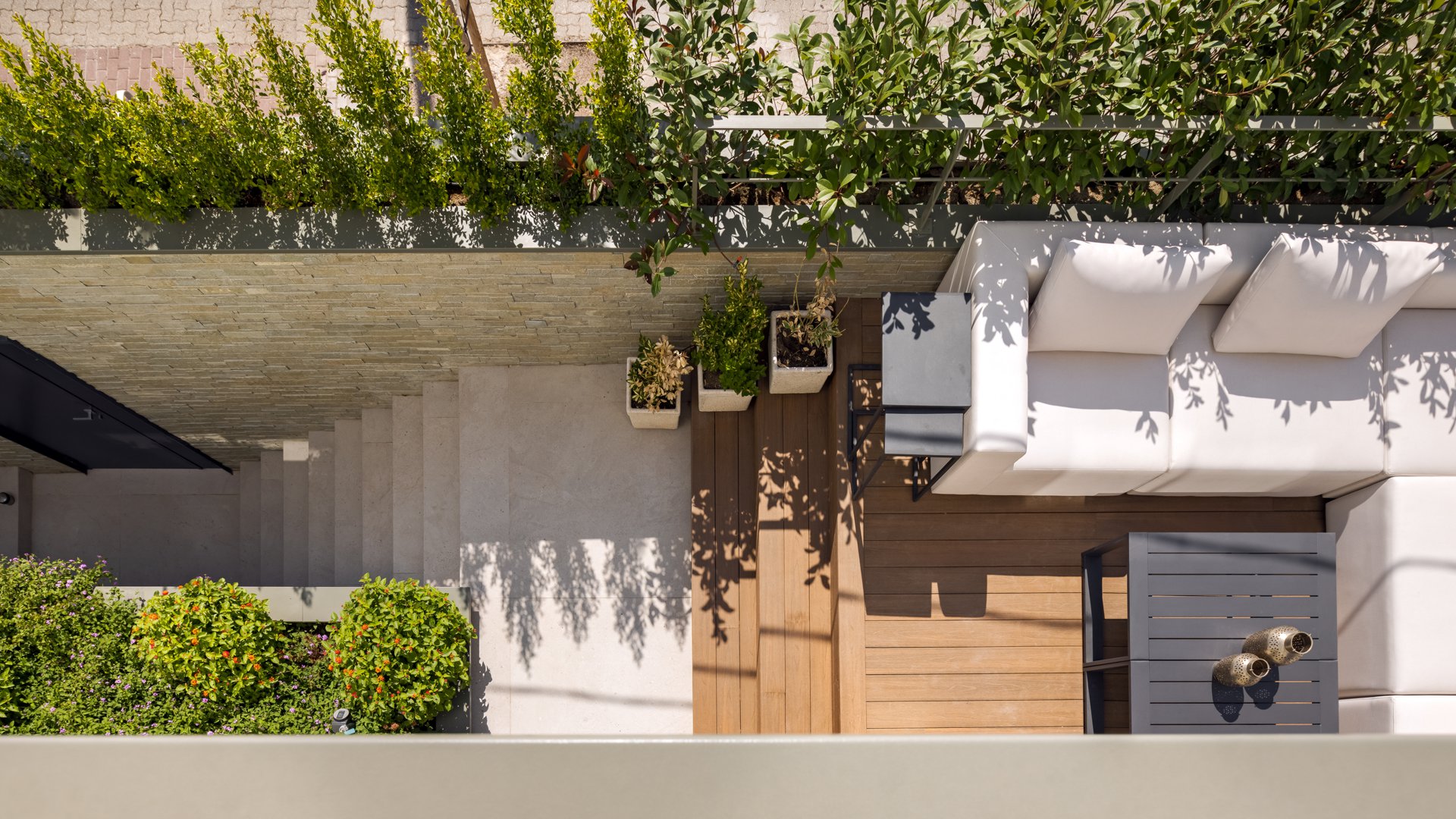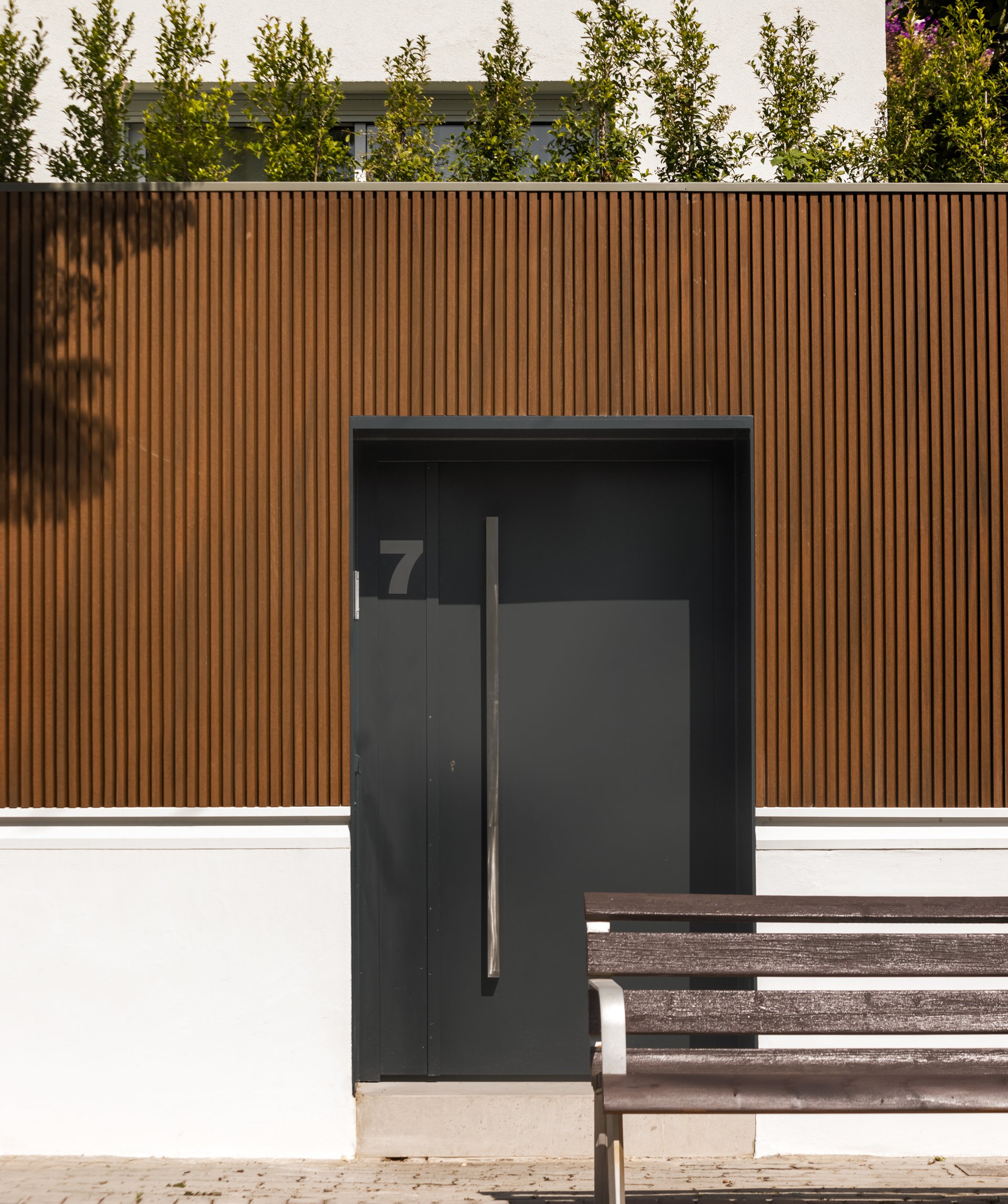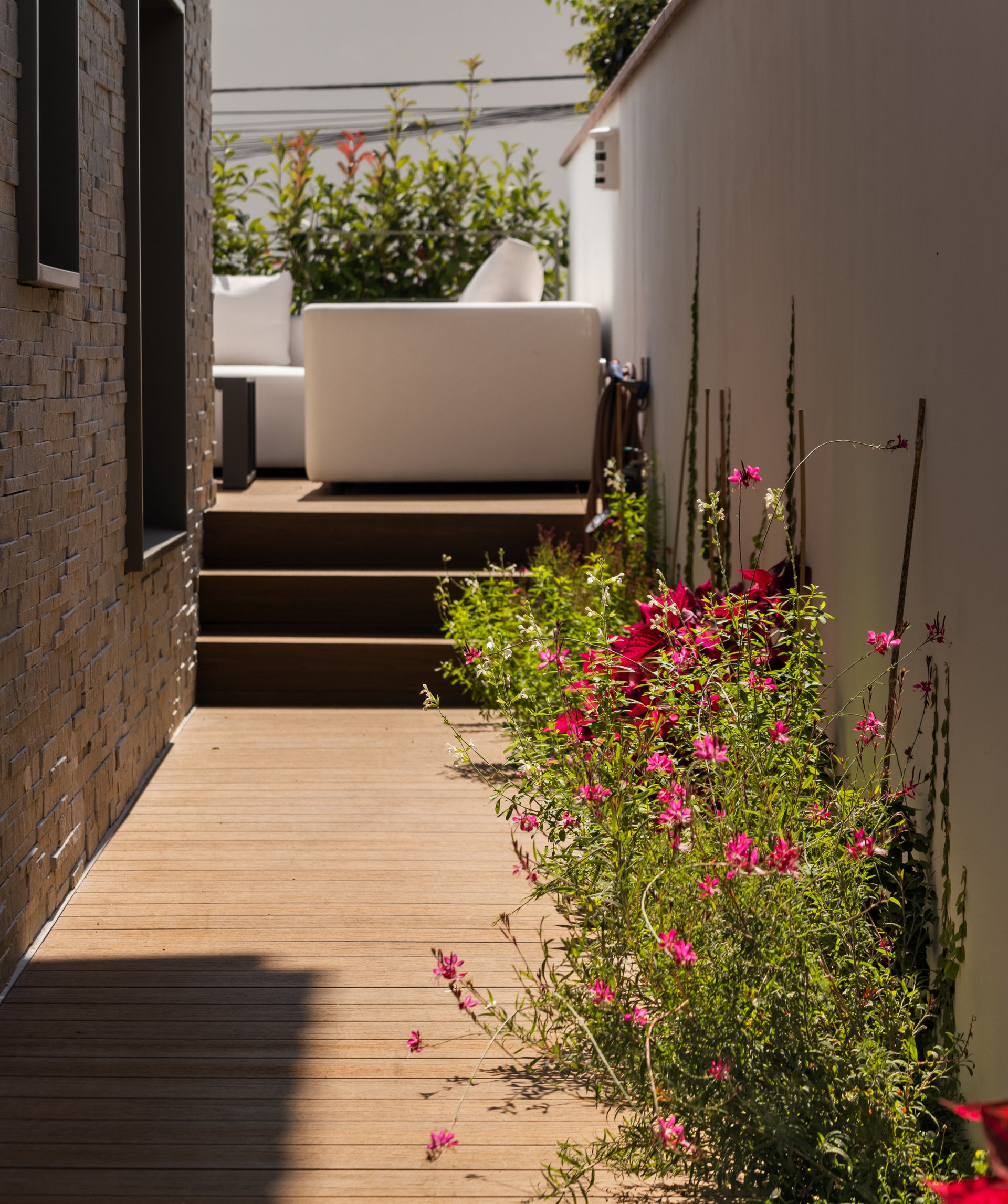 En la valla que se proyectó para el cierre de fachada, se otorgó una materialidad y altura, que proporciona la seguridad requerida, a la vez que hace de filtro visual al jardín de invierno ubicado sobre el garaje, renovando el estilo de la casa, sin perder su esencia.