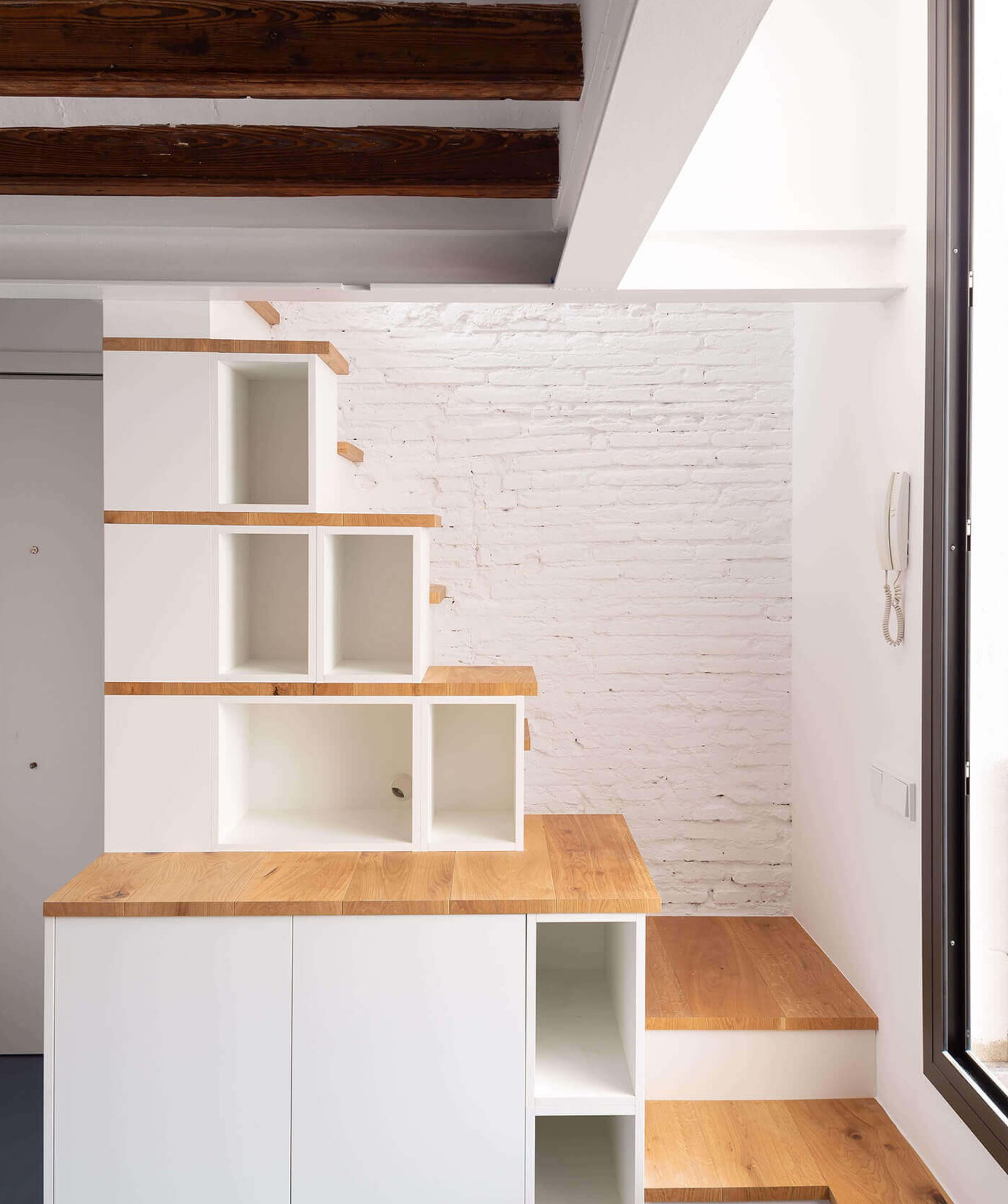La narración de esta casa surge de su posición en el ático de una antigua finca de Ciutat Vella: un espacio de tan solo 50 metros cuadrados, pero casi enteramente circundado de terrazas que se articulan en dos niveles y nos ofrecen una vista escenográfica de las cúpulas de la ciudad vieja.