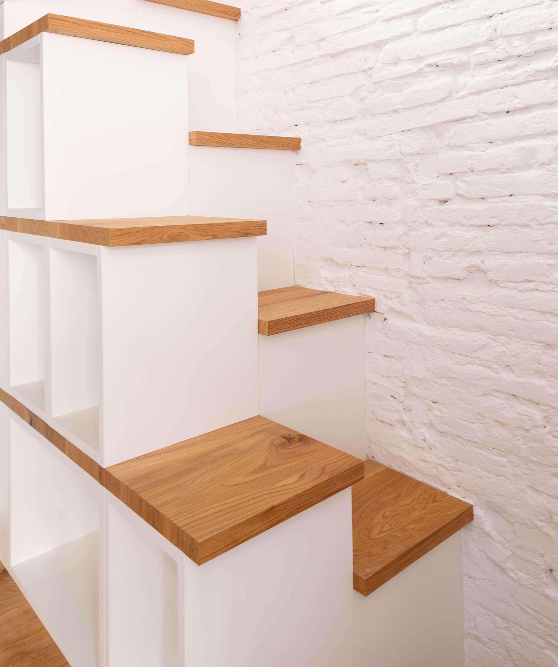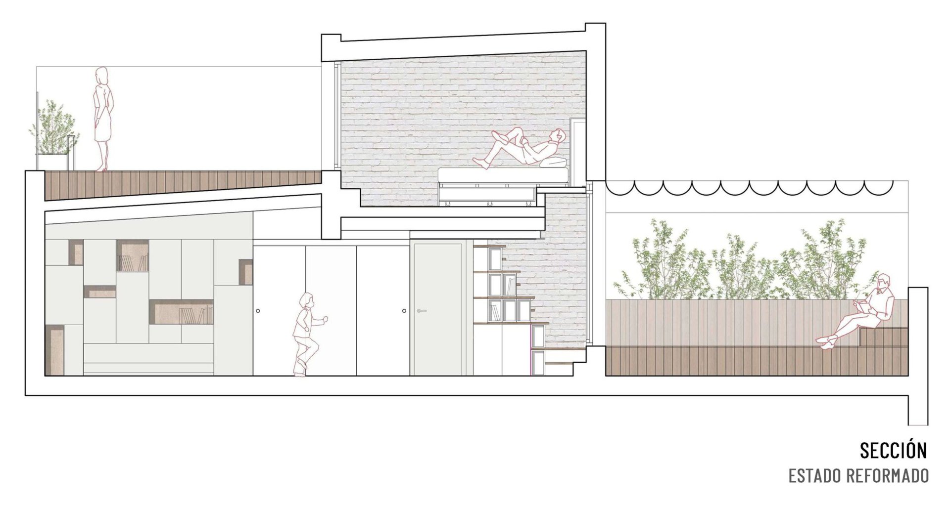 En la planta inferior, todo el espacio se articula en función de una gran estancia que funciona como salón y despacho, conectado sin ambages a la cocina; y que puede convertirse en dormitorio de huéspedes con dos sencillos movimientos de mobiliarios diseñados a medida.