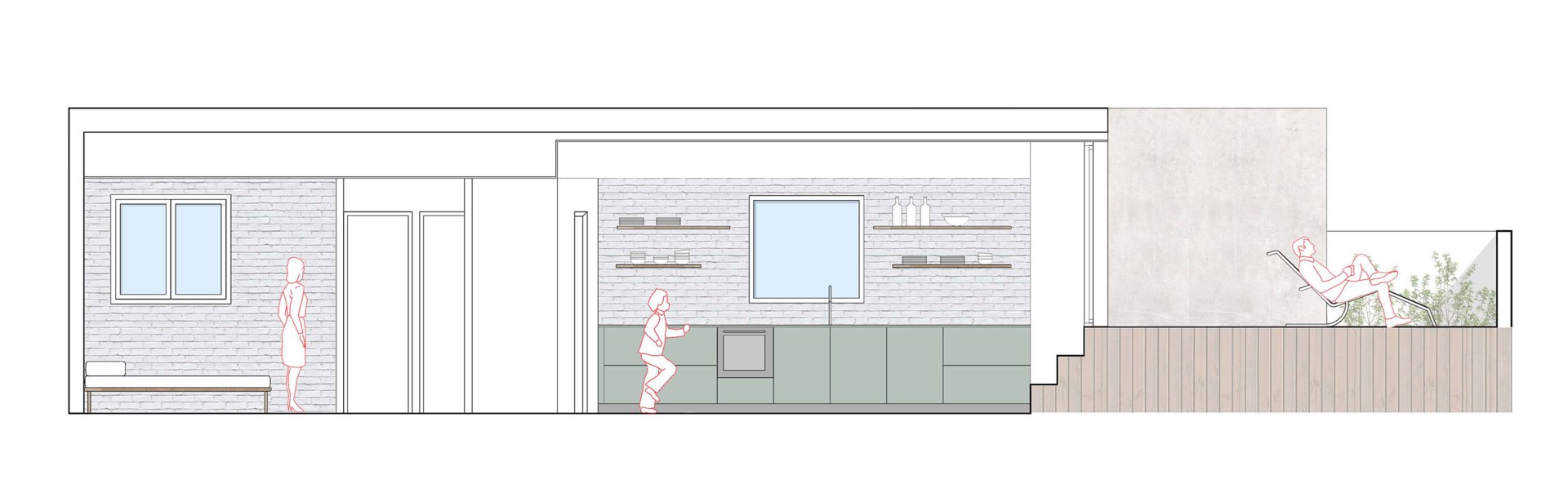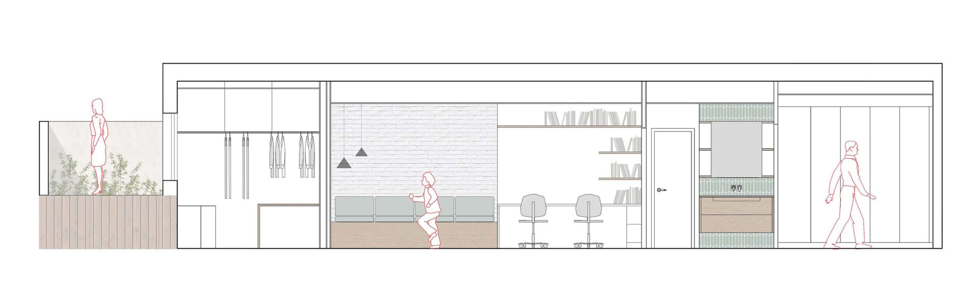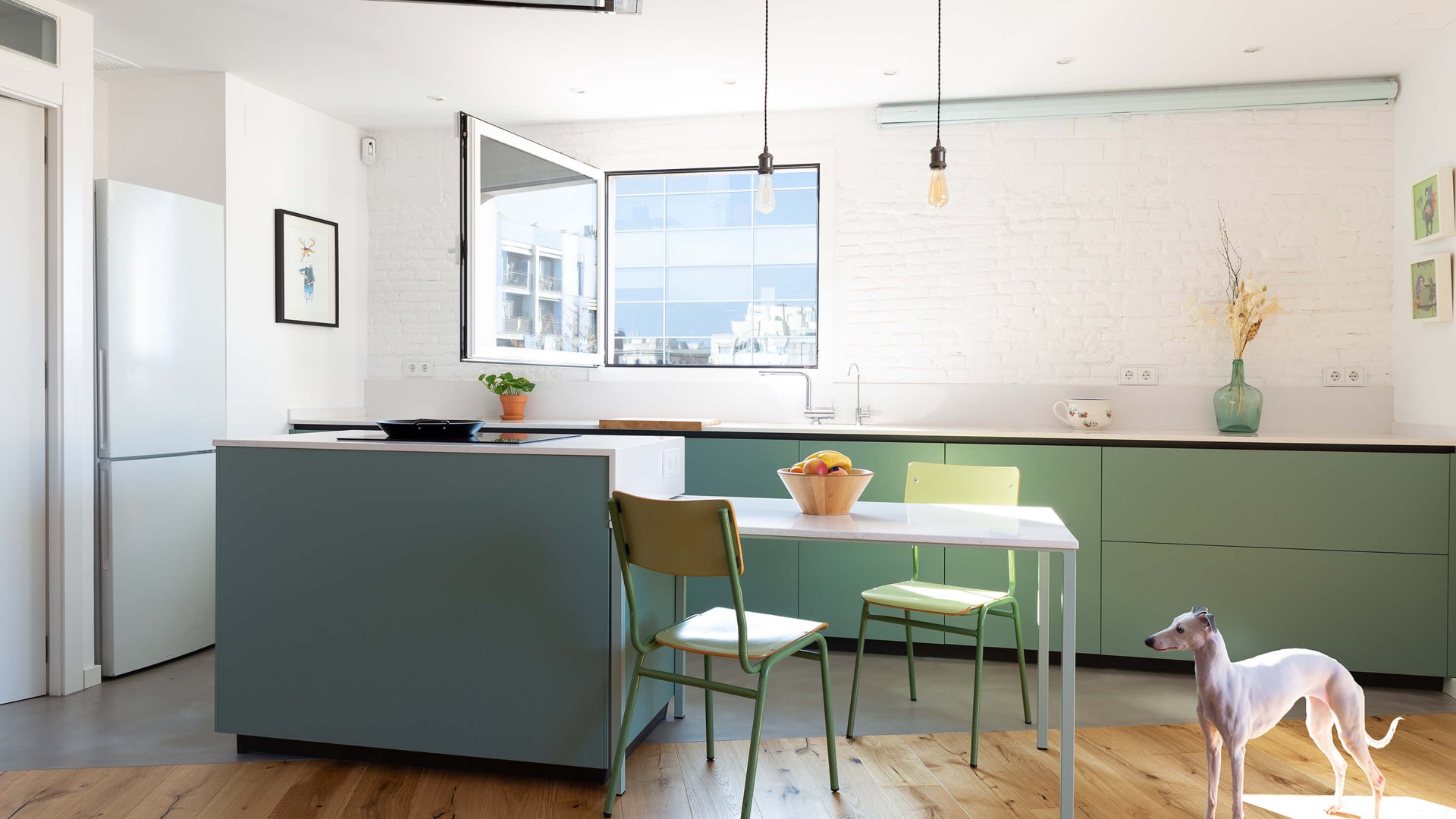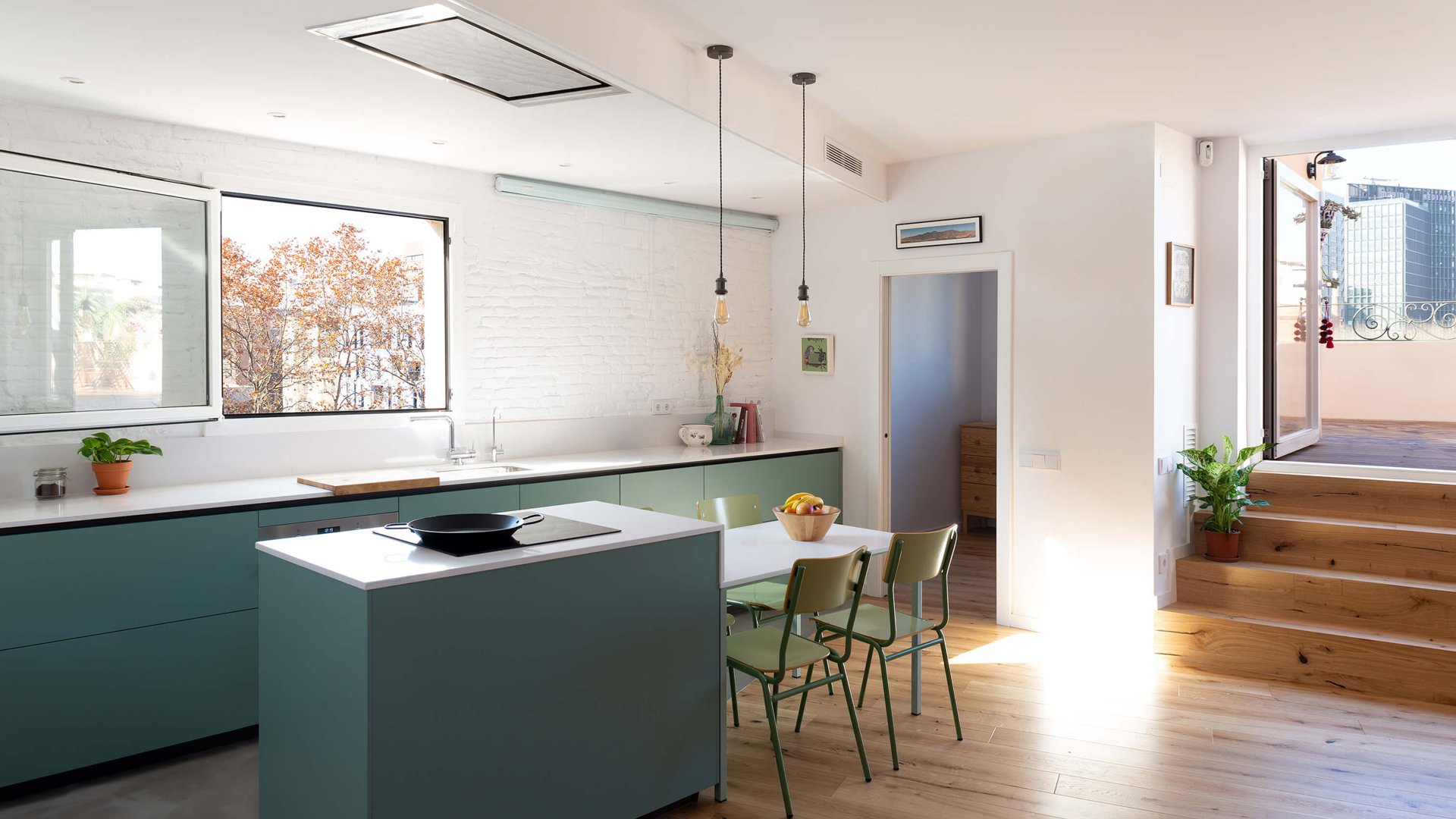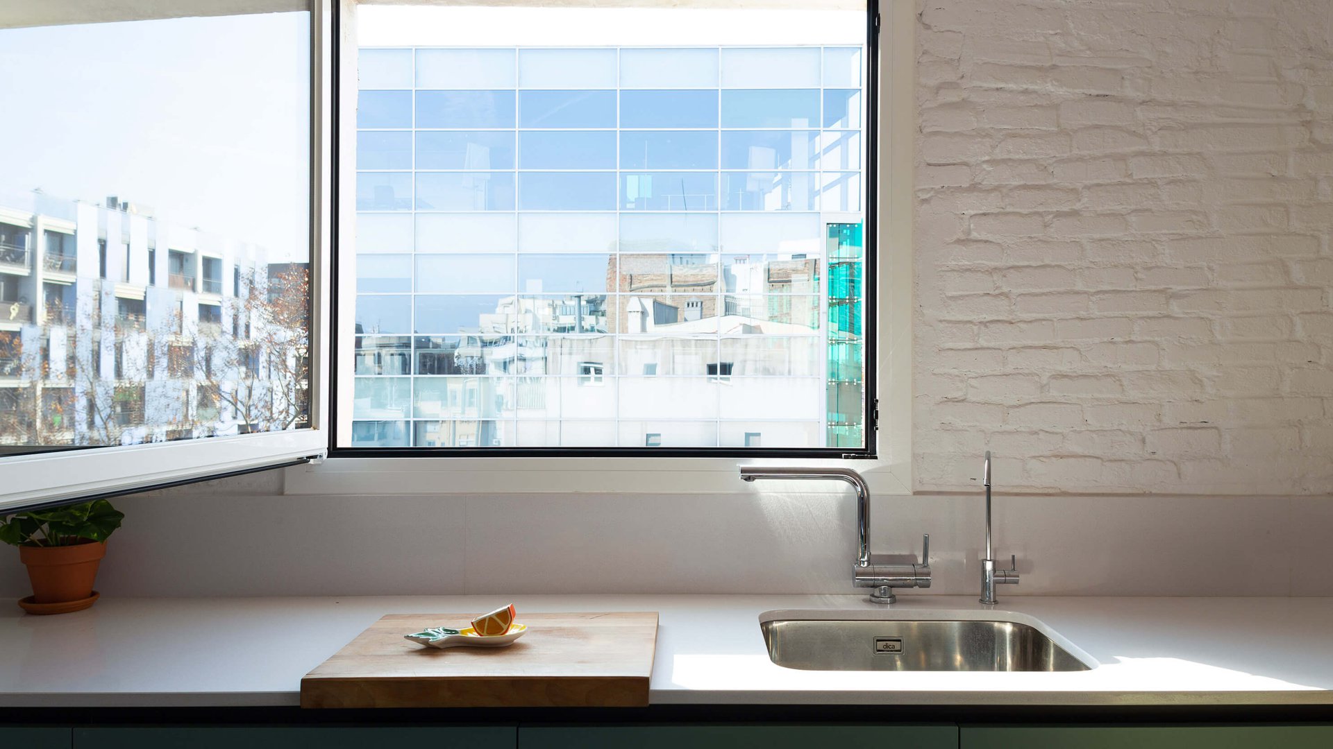 La cocina, sin muebles altos, permite que el espacio principal se ensanche, se inunde de luz y palpite con el barrio, nutriéndose de él, pero conservando la quietud.