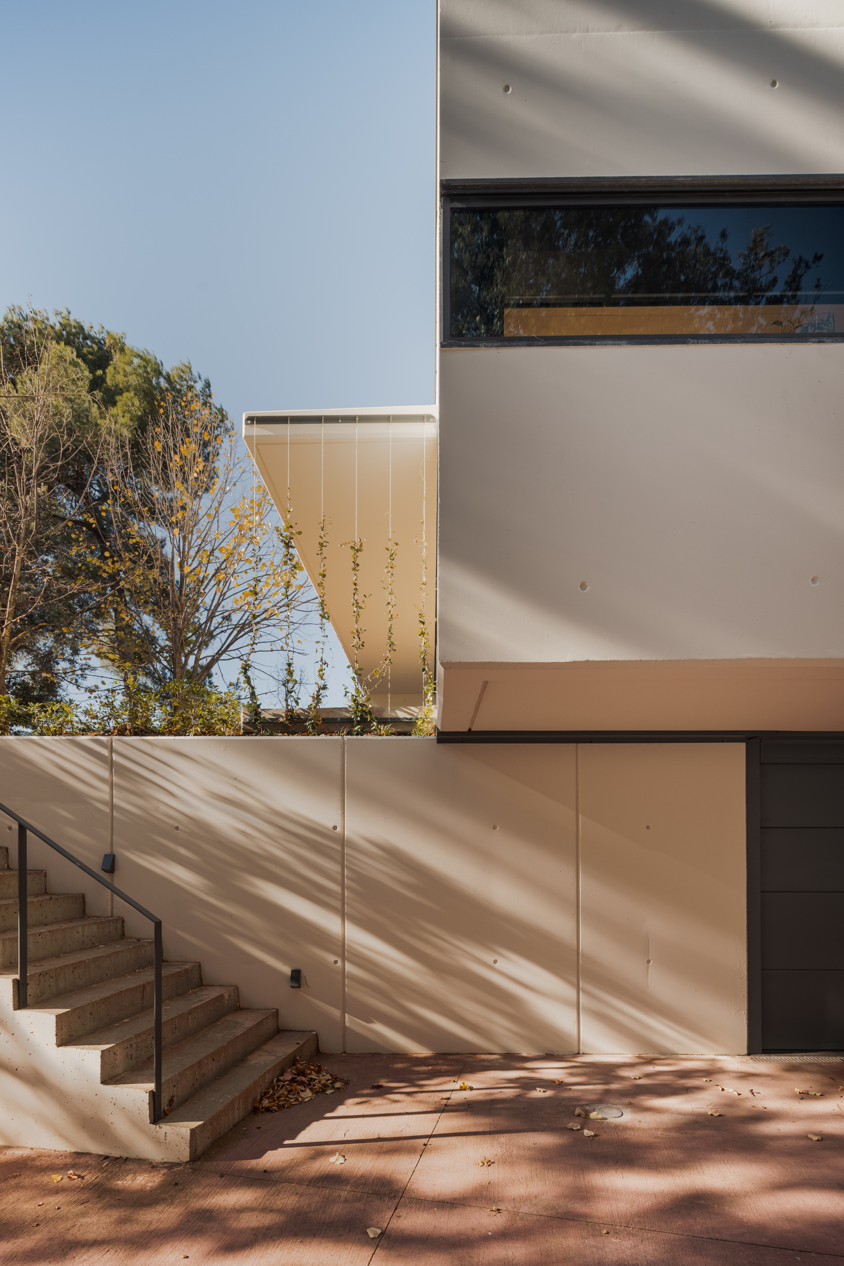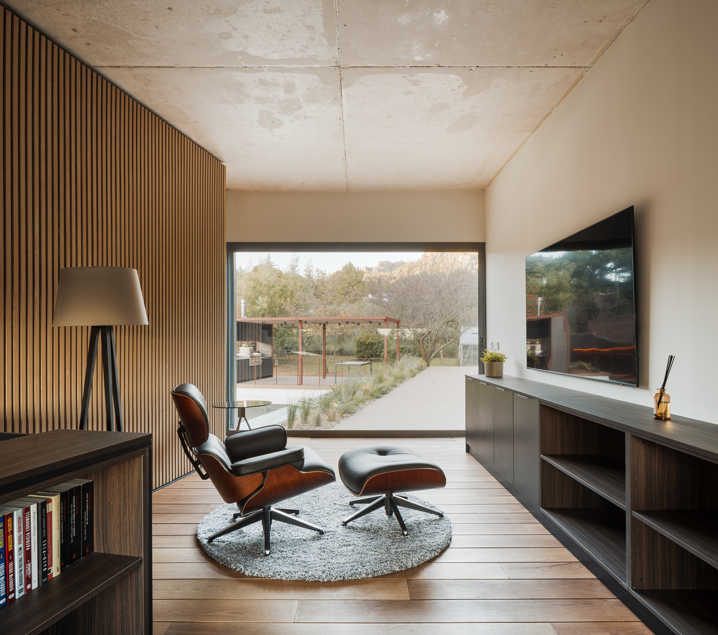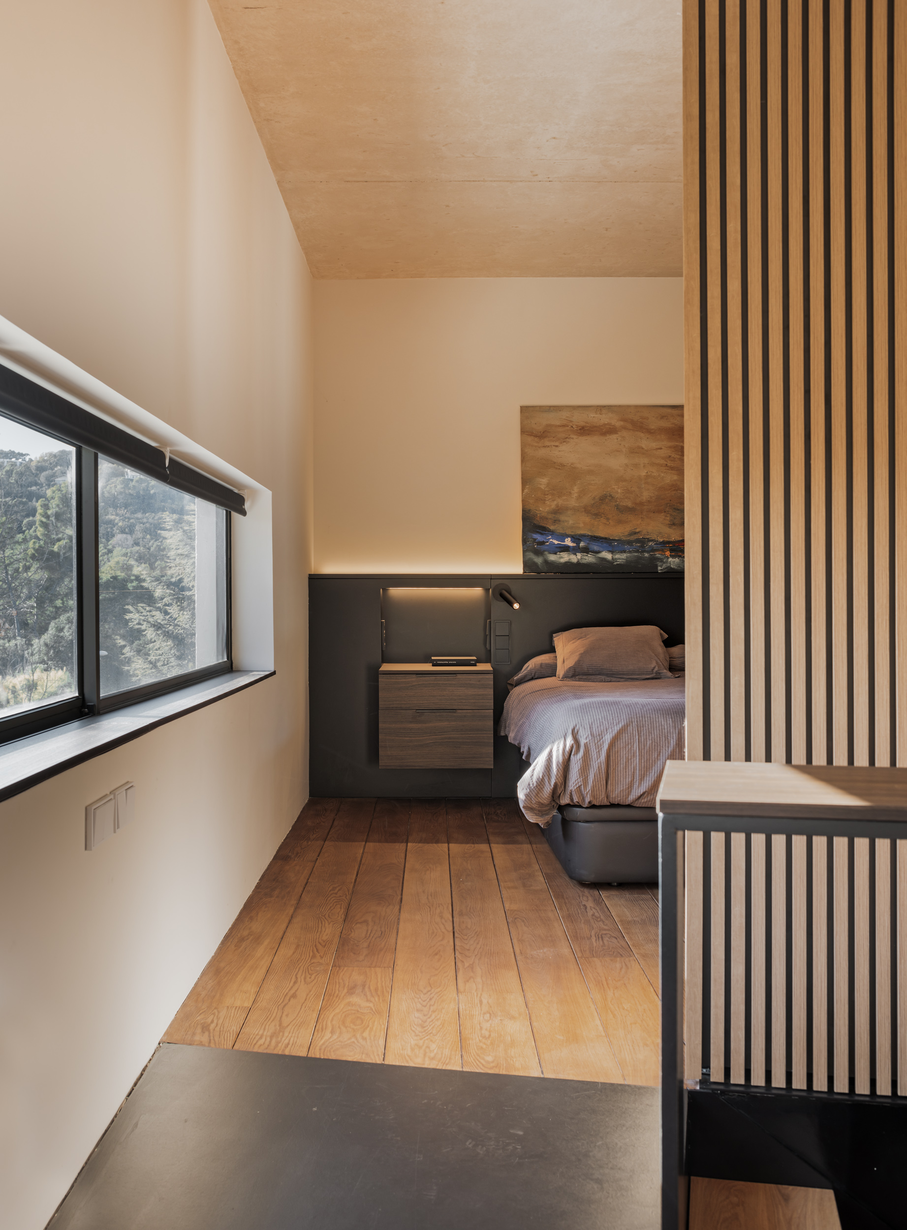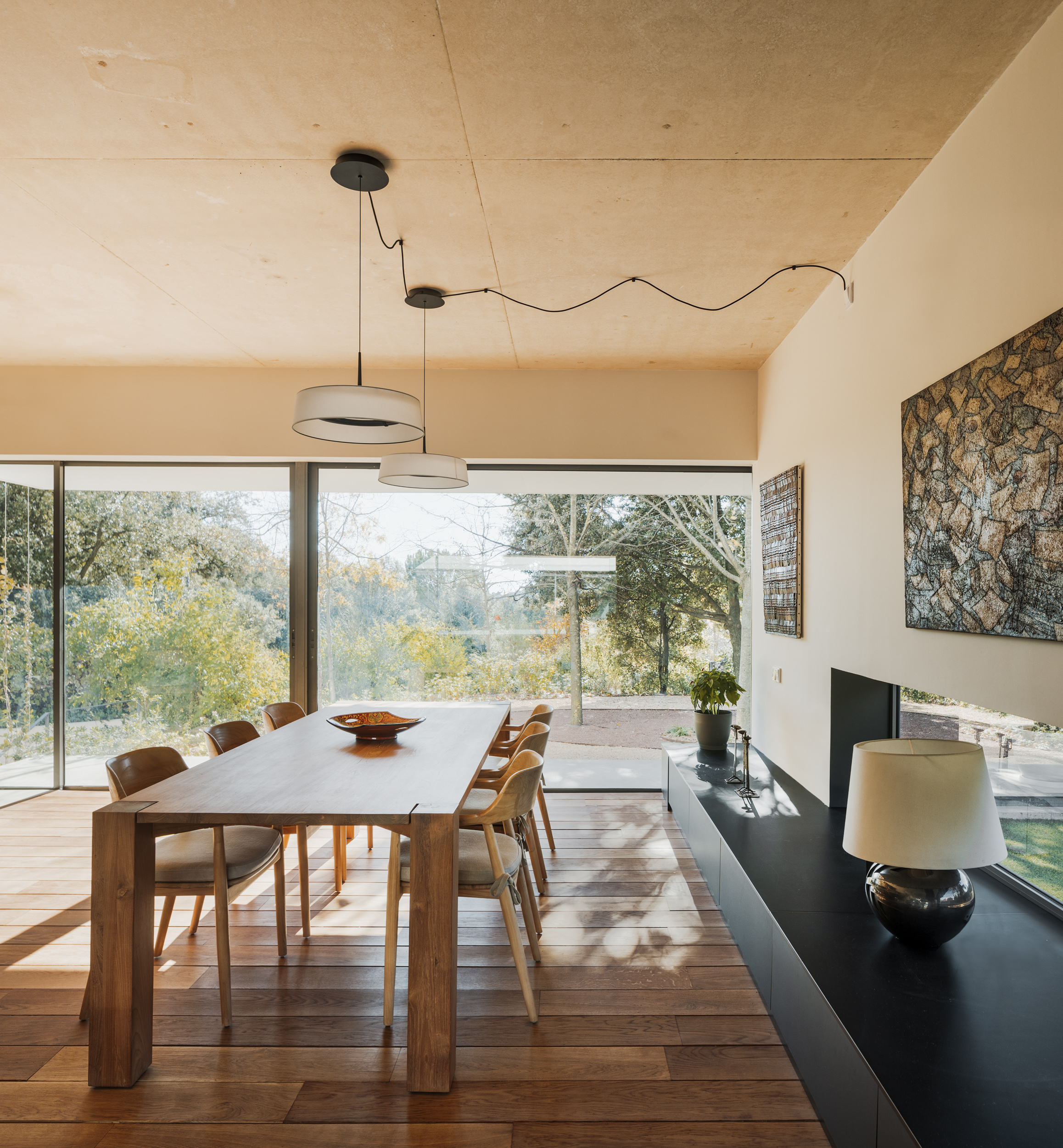 La cuidada implantación de la casa en el terreno permite disfrutar de amplias vistas del entorno, al tiempo que genera espacios exteriores más íntimos. Este equilibrio fue determinante para que el nuevo propietario, compartiendo el entusiasmo con Claudio González, decidiera adquirir la vivienda y confiarnos tanto el proyecto como la gestión de la obra. Fue, además, uno de los últimos proyectos de Claudio, que culminó con el rigor y la sensibilidad que siempre le caracterizaron.