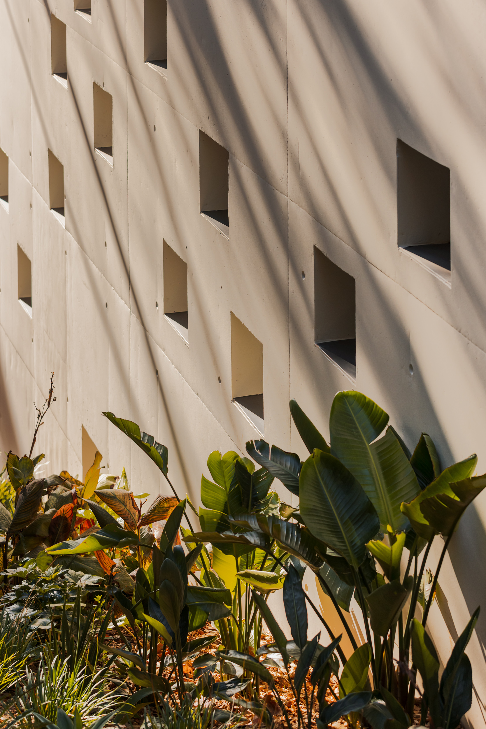 La nueva materialidad juega un papel fundamental en esta transformación. El uso de materiales de carácter orgánico, junto a una paleta cromática neutra y sosegada, introduce calidez y confort en contraste con la abstracción de la arquitectura original, generando una atmósfera más habitable y cercana.