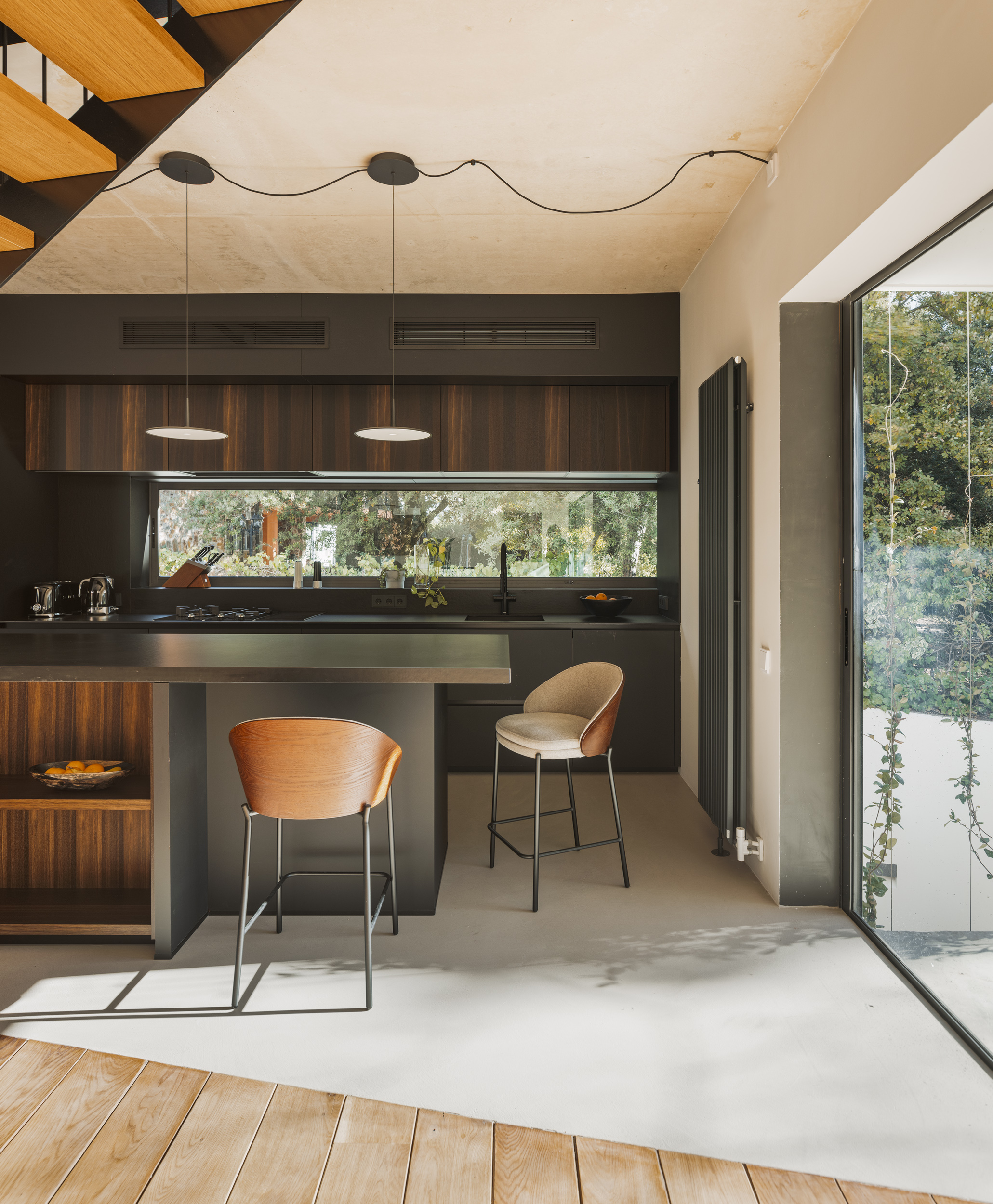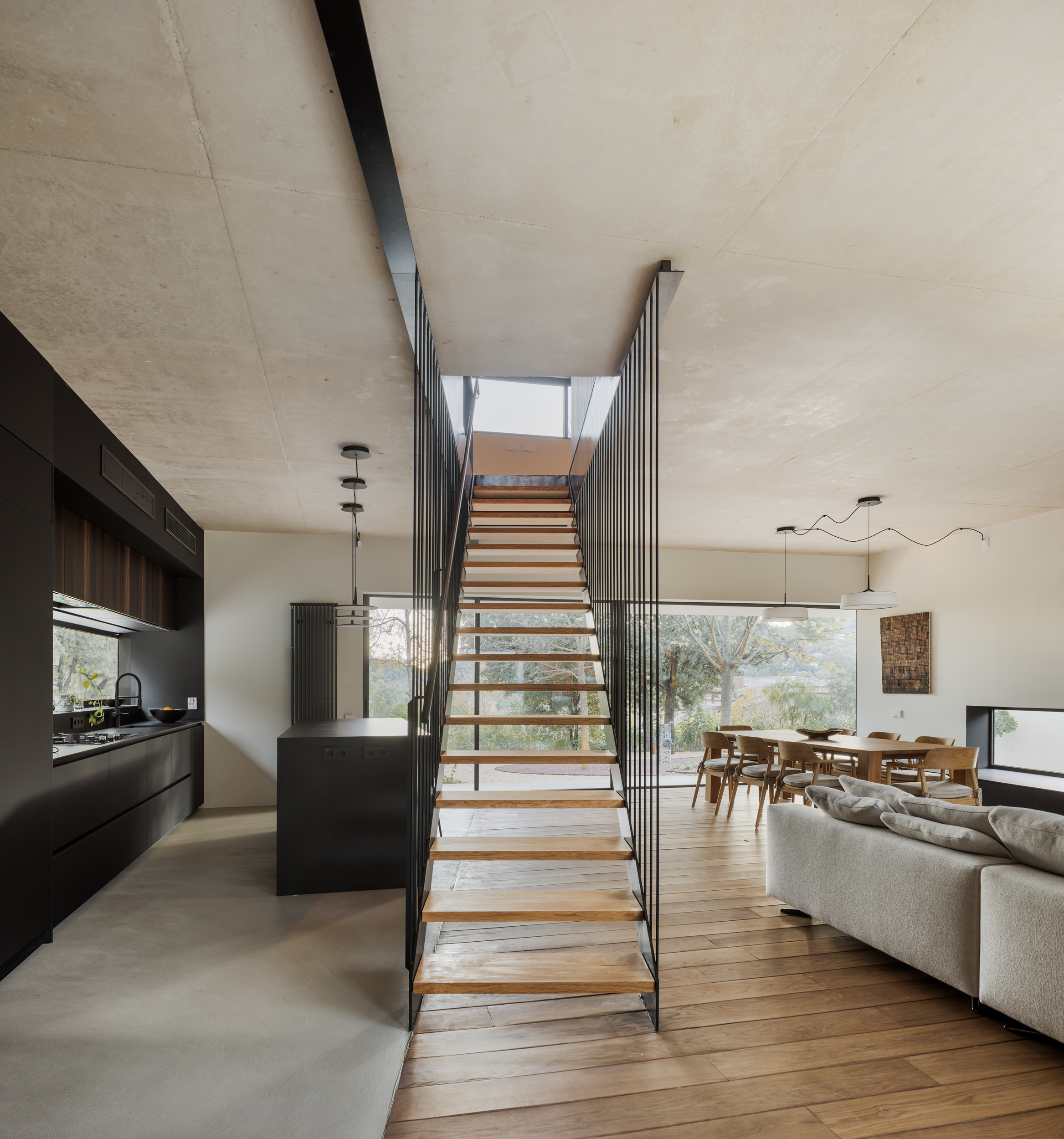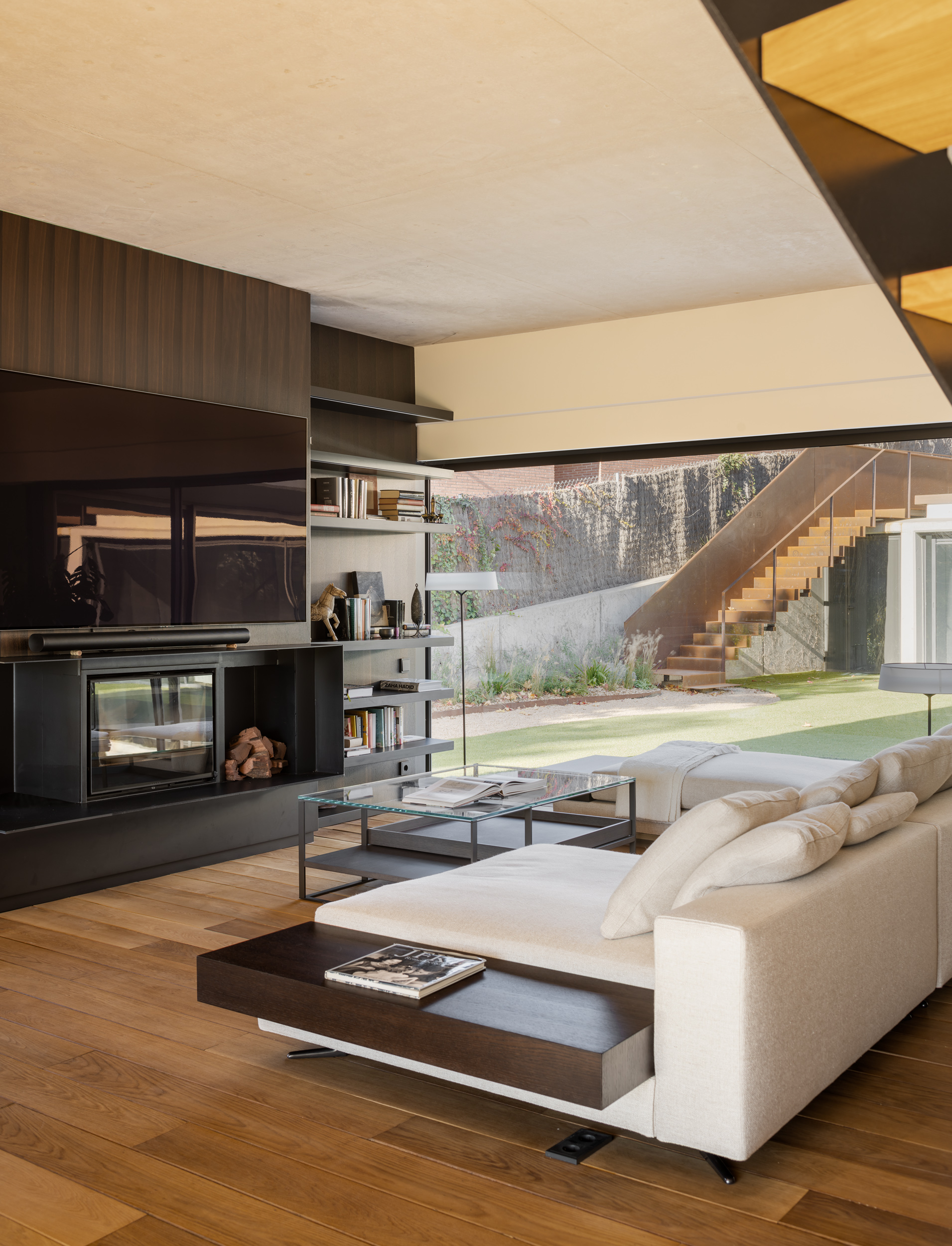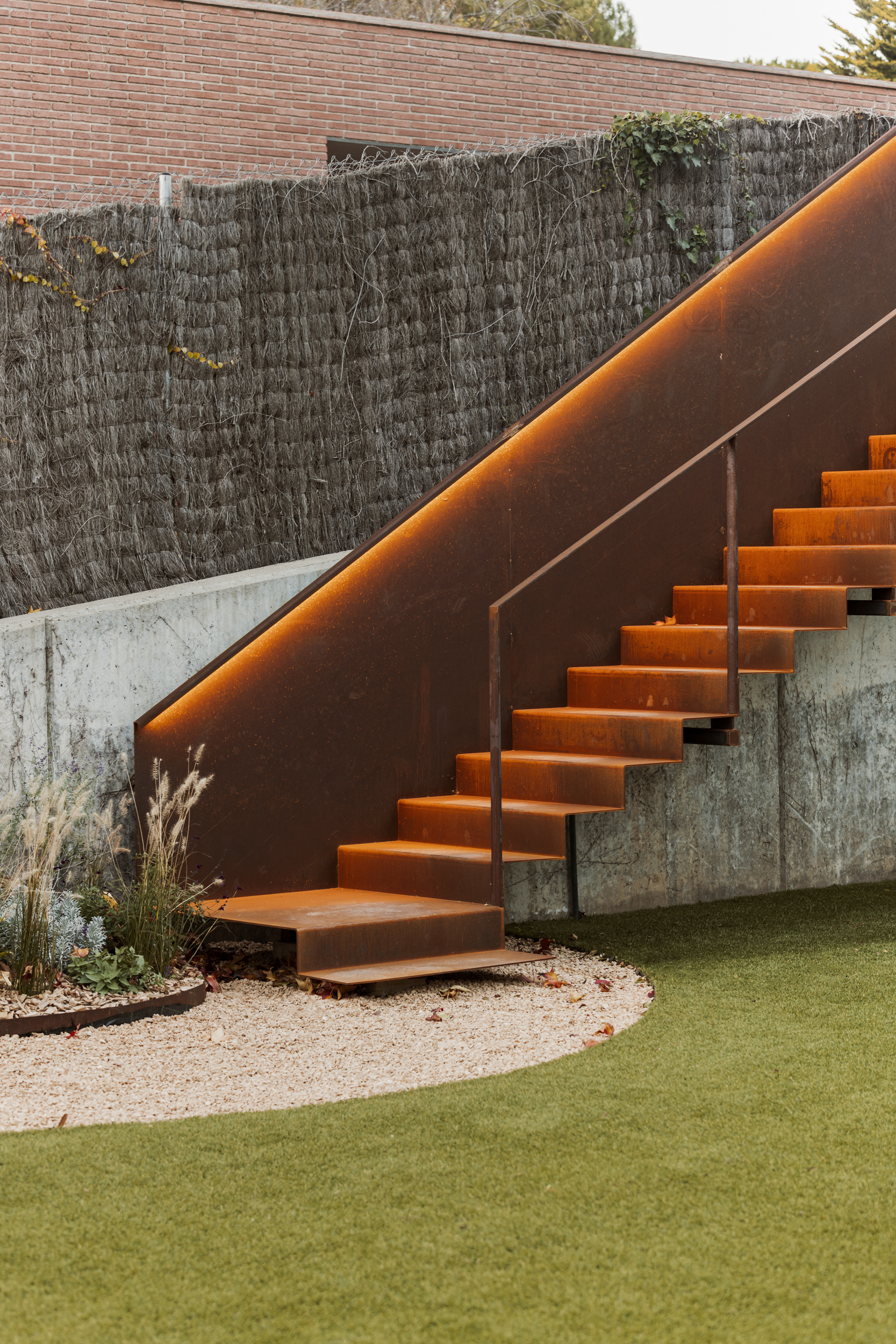 La intervención incorpora además una ampliación exterior que completa el programa doméstico: una escalera de acero corten, que abraza el jardín trasero, conecta con el nivel superior donde se sitúa la nueva zona de barbacoa, extendiendo el uso de la vivienda hacia el exterior.