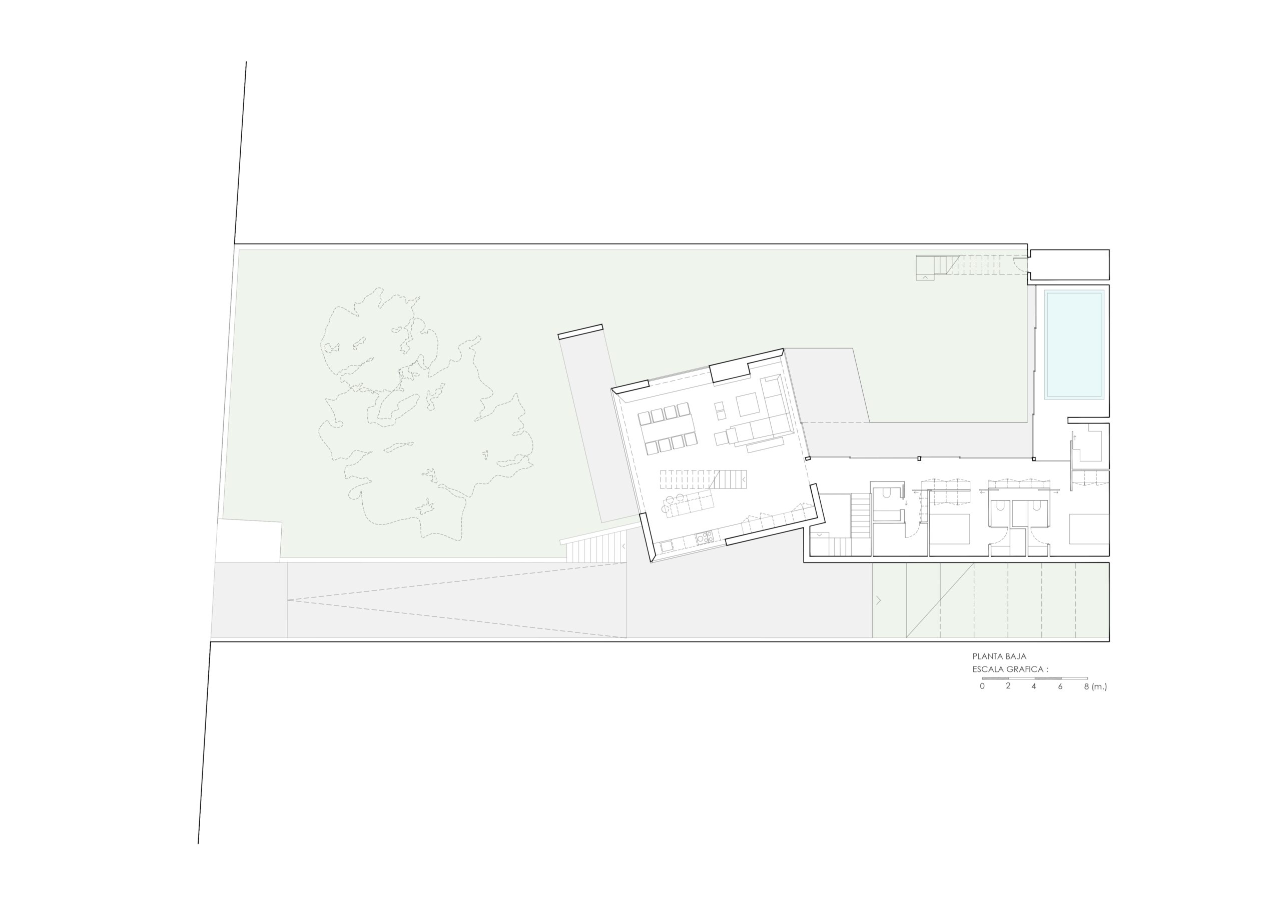 El cuerpo principal, de forma cúbica, alberga el programa funcional central, donde hoy hace vida la nueva pareja propietaria. Mientras tanto, el paralelepípedo, insertándose en el terreno, acoge la zona de invitados y los servicios anexos. La disposición y el encuentro de ambos cuerpos, generan una serie de espacios interiores y exteriores que organizan el acceso principal y el jardín interior.