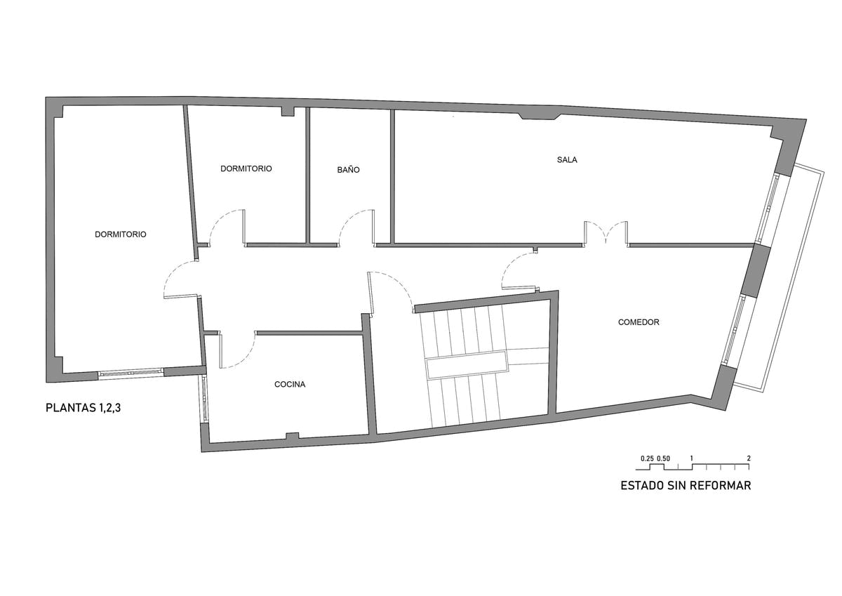 Las tres viviendas están organizadas a partir de una única tipología que se repite en cada planta: disponen de un espacio de día con cocina abierta orientadas hacia la calle. Se ajustan las dimensiones de la zona posterior para encajar dos dormitorios y dos baños completos en la zona central y se plantea la posibilidad de una futura división para ganar un tercer dormitorio, si el usuario lo requiere.