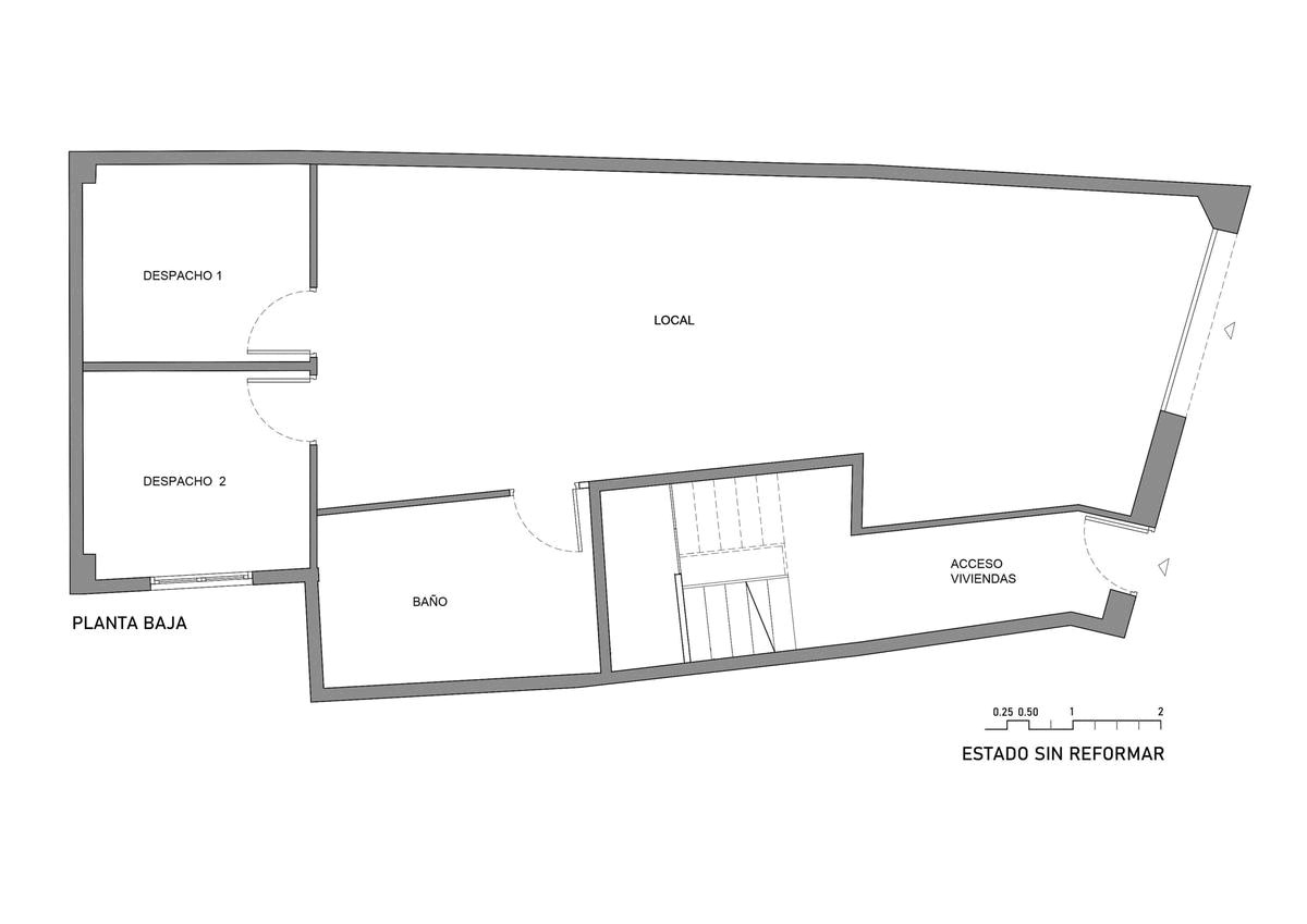 La planta baja recupera su fluidez, encajando las piezas de servicios en el recodo que deja el vestíbulo del edificio. De esta forma, la actividad comercial que se instale podrá disponer de una huella fácil de reorganizar en su distribución.