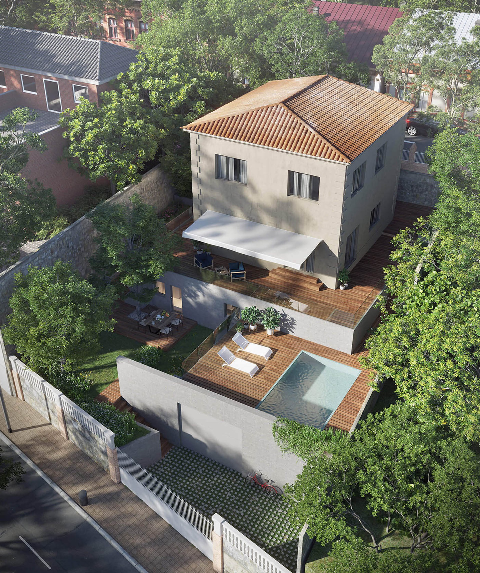 La casa está situada en el barrio Horta-Guinardó, una zona alta de Barcelona muy bien comunicada con el centro de la ciudad, pero con un tejido urbano más abierto, por lo que da la sensación de estar muy lejos del bullicio de la urbe.