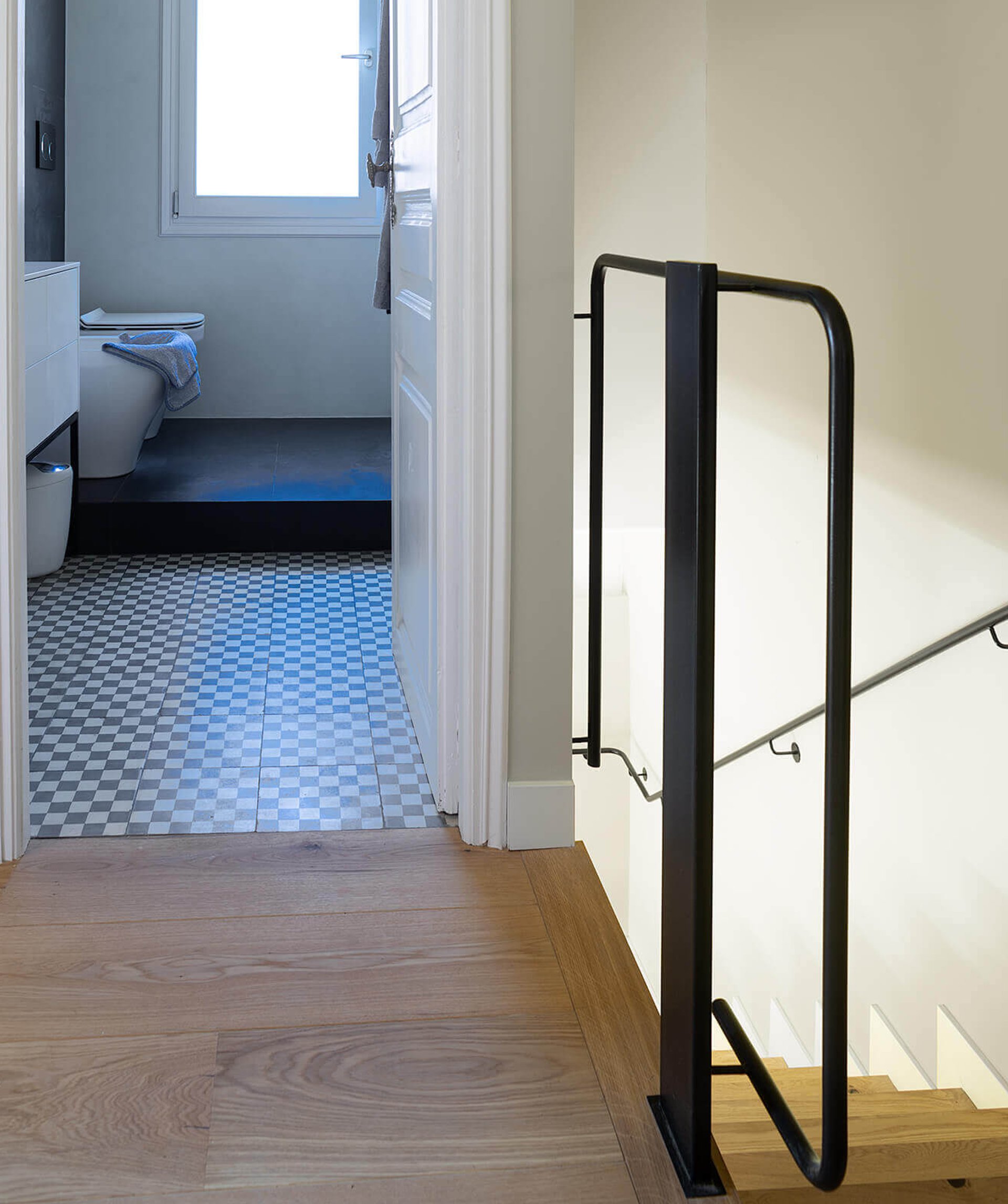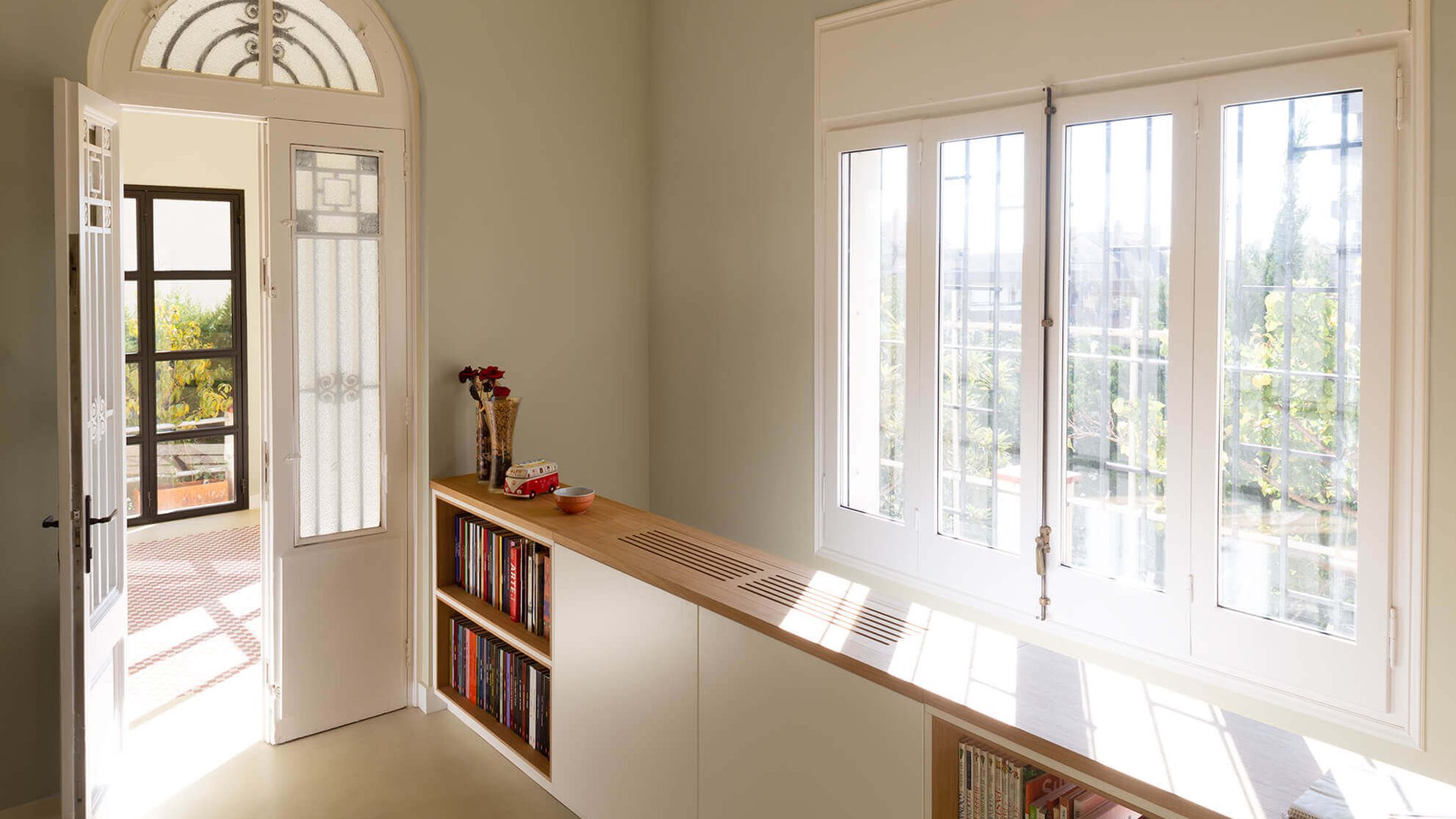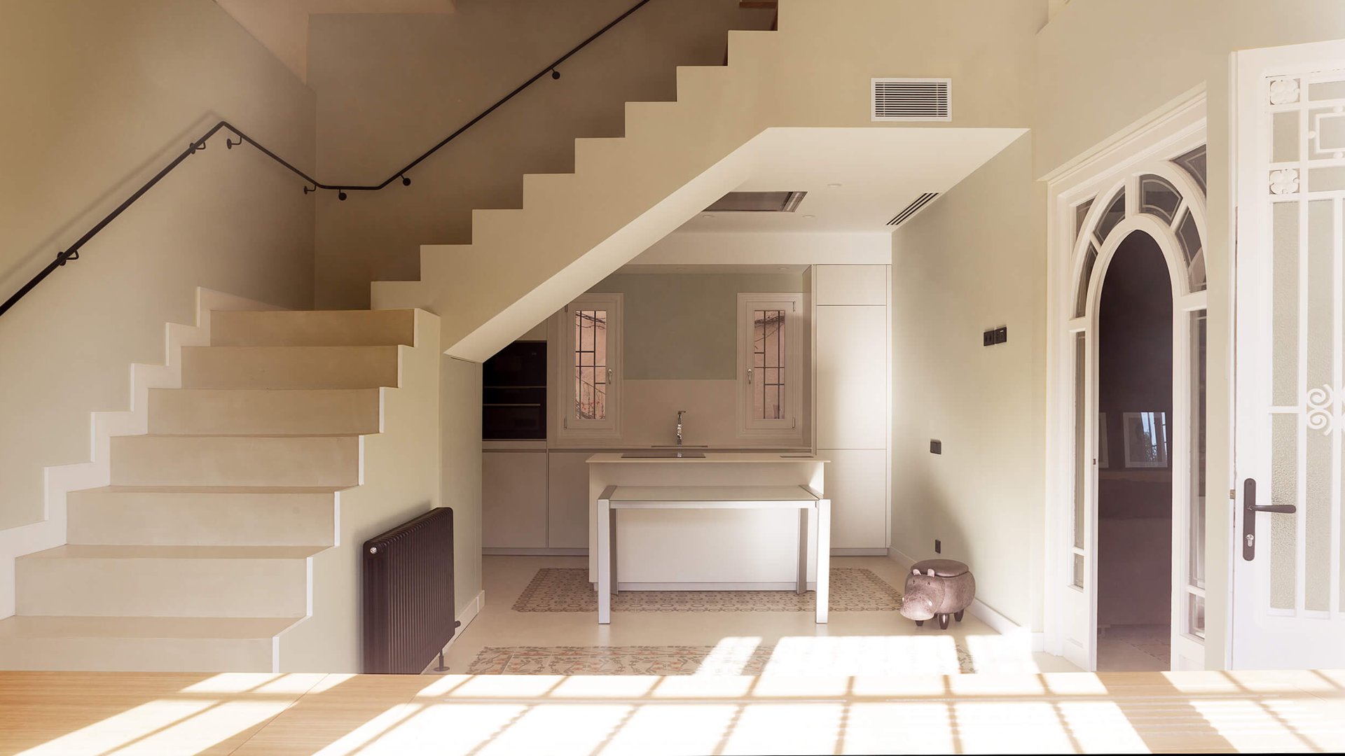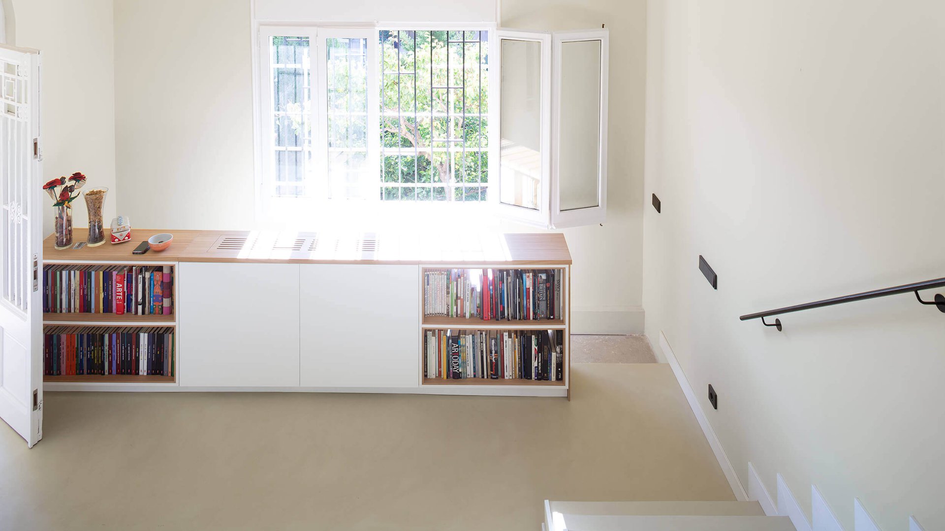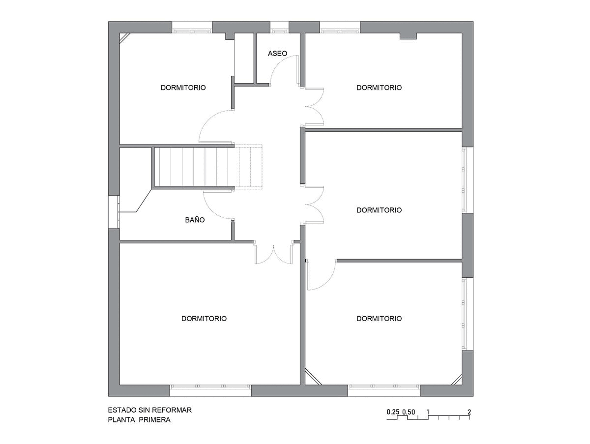 En la reformulación del espacio interior, el cambio de posición de uno de los tramos de la escalera, permite potenciar la unificación de usos, diluyendo antiguos límites, ganando en visuales cruzadas interiores y captando la luz natural del sur que llega hasta la fachada norte.