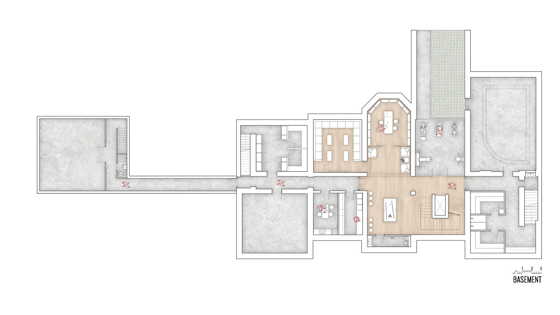 En la planta semisótano, se ubican las dependencias de servicio, almacenes, cuartos de instalaciones, sala de juegos, sala de música, sauna, gimnasio, piscina cubierta y bodega.